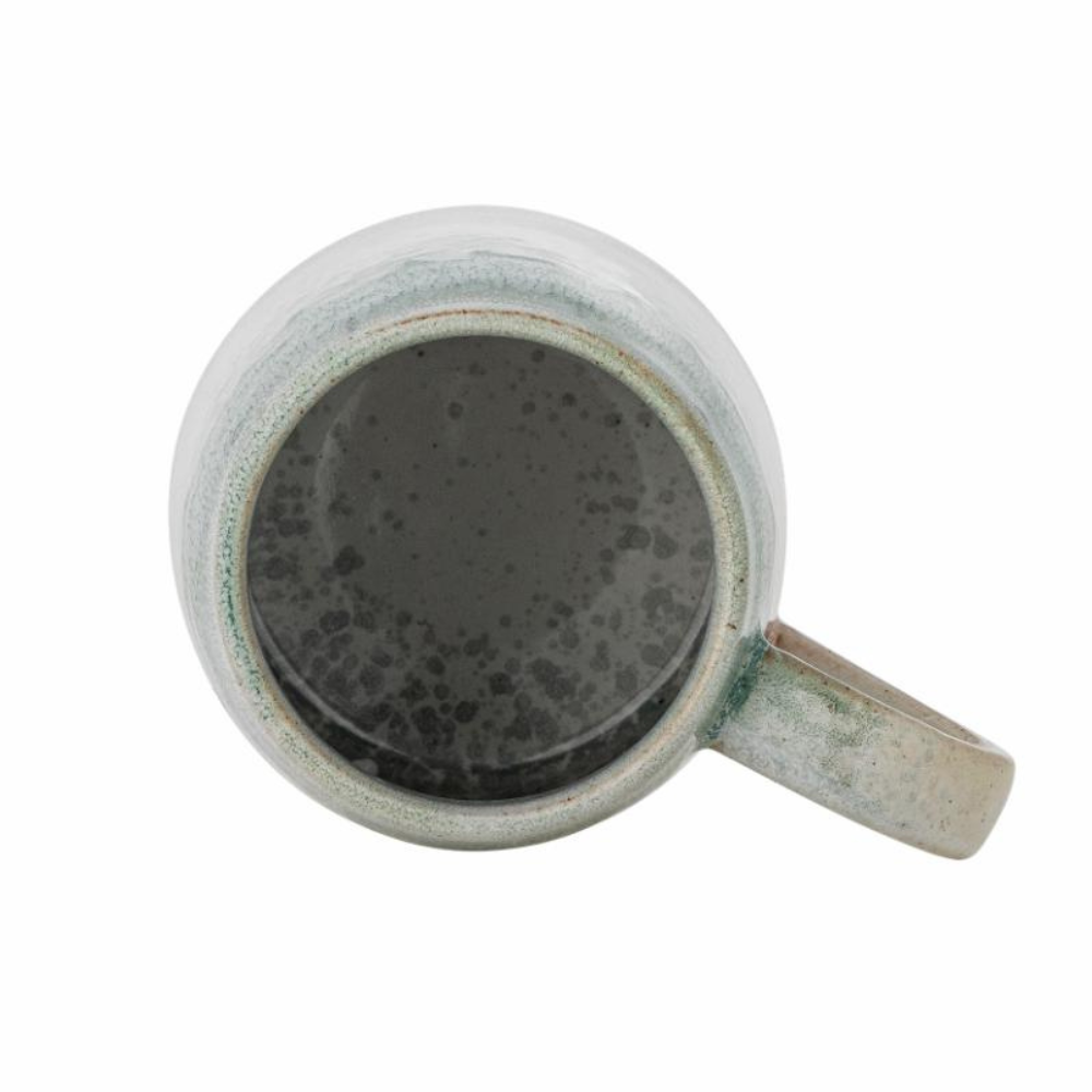 Sada kameninových hrnků s tlumenou zelenou barvou s krémovými a růžovými tóny skvěle doplní aranžmá v duchu přírody.