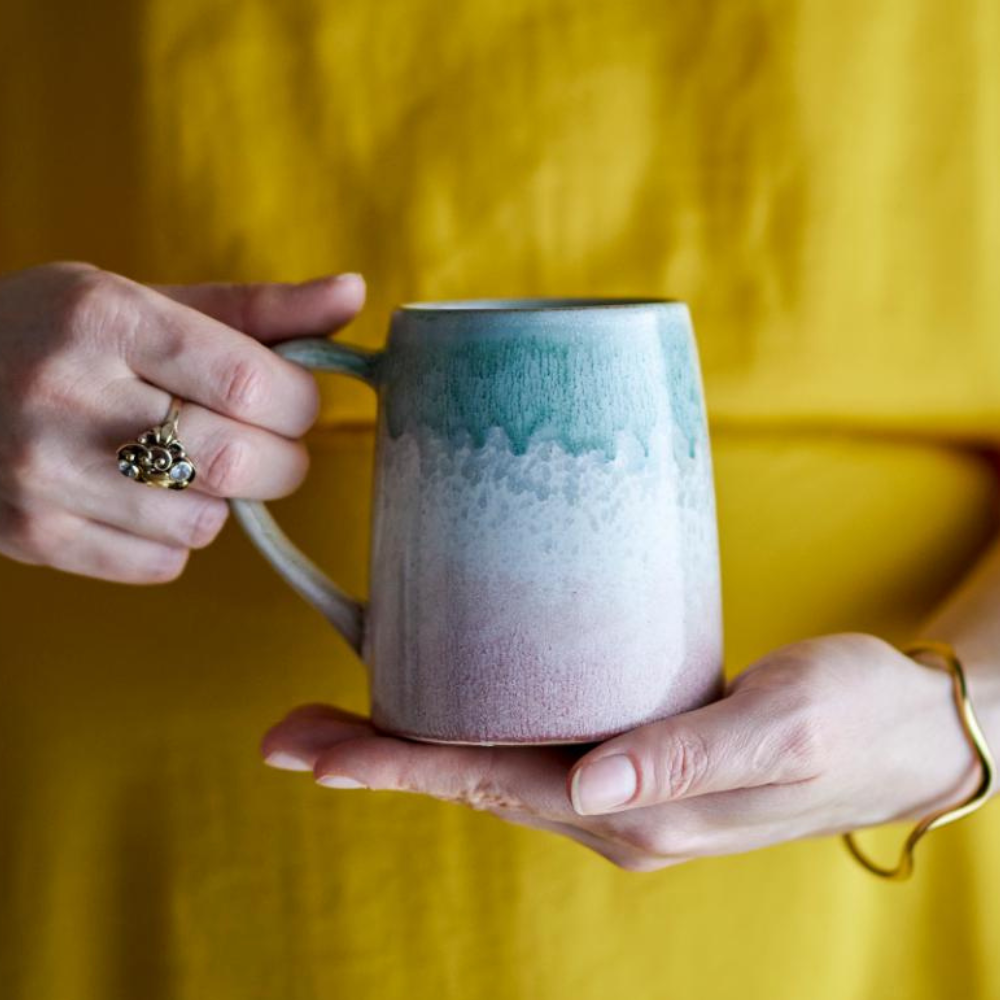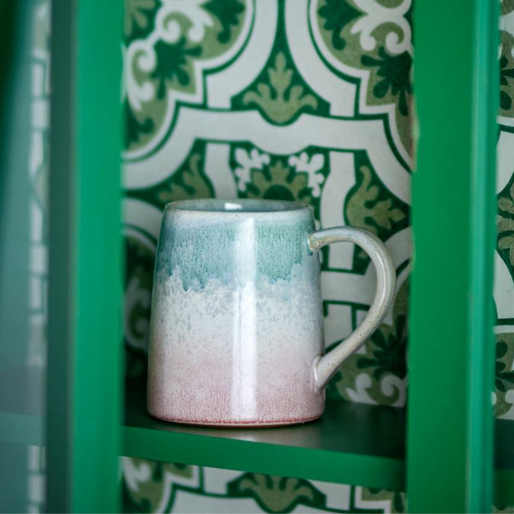 Tato sada kameninových hrnků zaujme reaktivní glazurou - na každém kusu je vzor a intenzita barev uspořádána trochu jinak, takže každý hrnek je jedinečný.