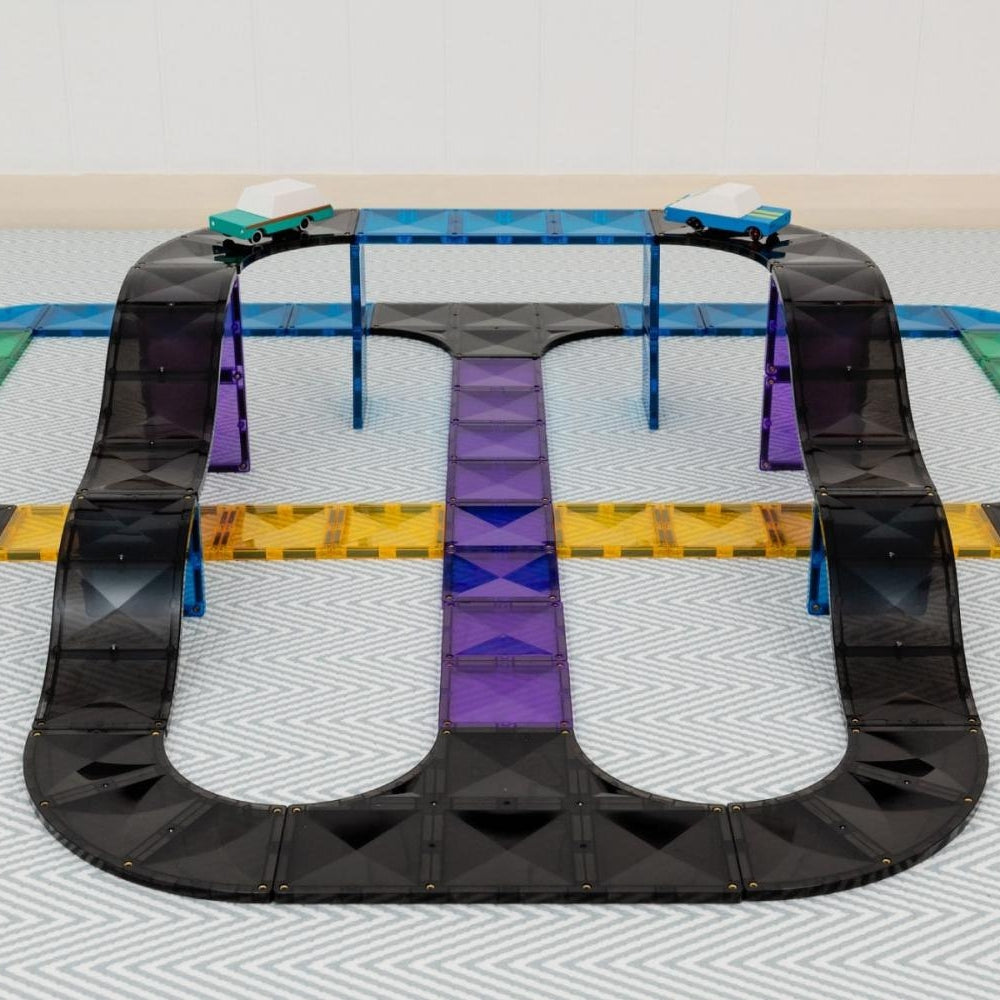 Sada 16 dílků silnic, ramp a křižovatek od společnosti Connetix obsahuje jedinečné tvary magnetických kostek inspirované silnicemi, včetně čtvrtkruhů, zatáček, křižovatek a dlouhých a krátkých ramp, to vše v elegantním černém odstínu.