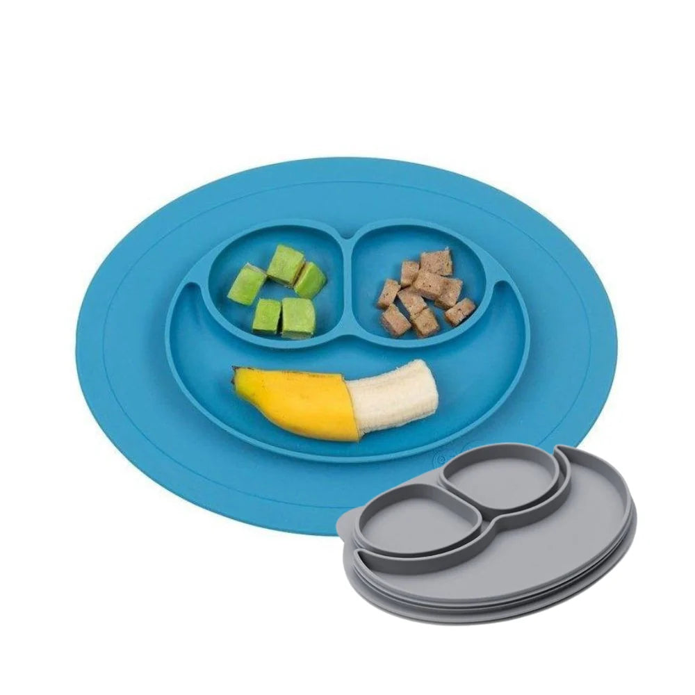 EZPZ Silikonová modrá deska s podložkou malá 2v1 Mini Mat je praktická podložka a deska v jednom. Je vyrobena z bezpečného silikonu. Dodává se v uzavíratelném obalu, takže si ji můžete vzít s sebou na cesty. Tato moderní silikonová podložka dokonale přilne ke stolu nebo jinému hladkému povrchu. Zabrání tak tomu, aby vám dítě ze stolu sklouzlo. Má oválný tvar a estetický design. Talířek je rozdělen na 3 přihrádky, což umožňuje rozdělit jídlo na porce.