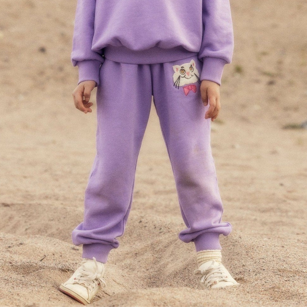 Kočka s motýlkem Fialové dětské tepláky Mini Rodini.