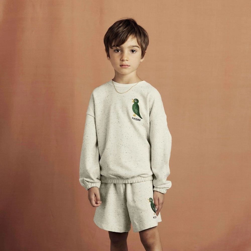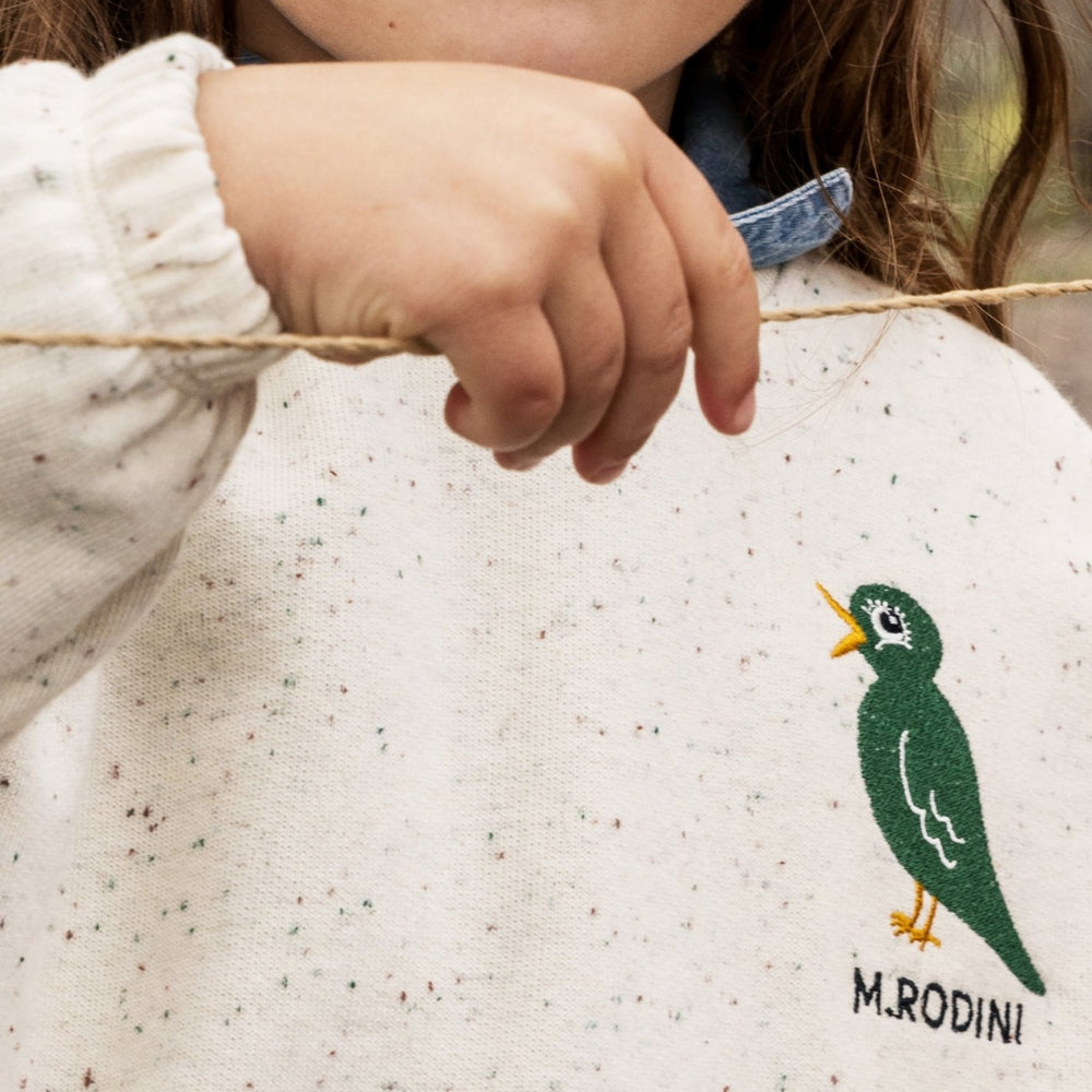 Žebrovaný límec podtrhuje ležérní styl mikiny, zatímco jemná vyšívaná nášivka ptáčka na hrudi je decentním, ale výrazným detailem, který je v souladu s estetikou značky Mini Rodini.