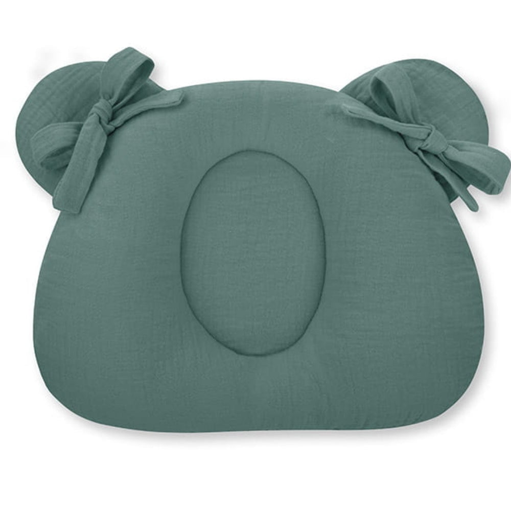 Dětský polštář Sleepee je vyroben z měkkého bavlněného mušelínu a má tvar hlavy medvídka.
