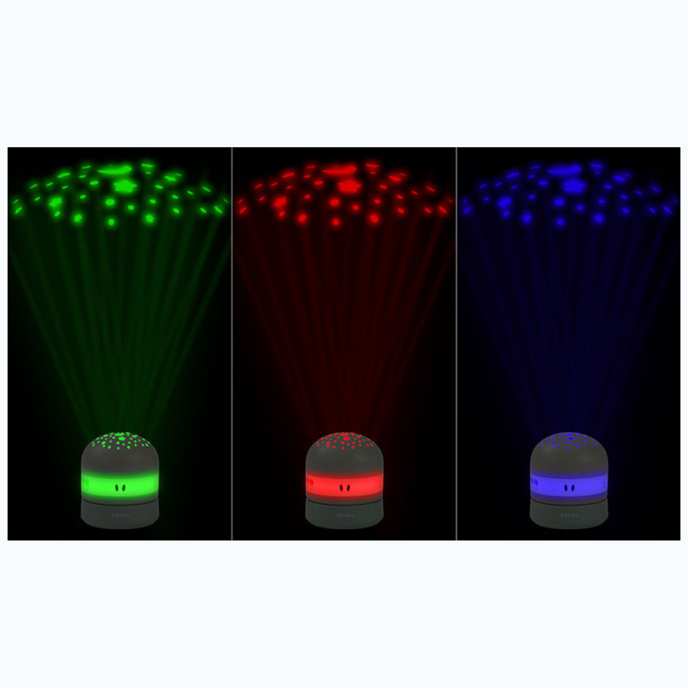 Zařízení Beaba promítá hvězdy ve třech barvách - červené, zelené a modré - s možností volby stálého, měnícího se nebo náhodného světla. Nastavitelný úhel projekce umožňuje nasměrovat obraz na strop, stěnu nebo na místo, které si vyberete - přesně tam, kam se vaše dítě před spaním rádo dívá.
