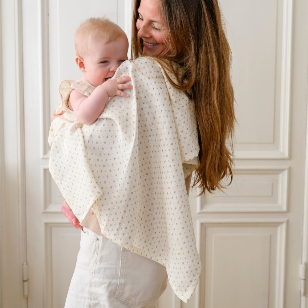 Díky svým velkým rozměrům 120x120 cm bude dobře fungovat i jako lehká deka, prostěradlo do nosítka nebo přikrývka na krmení.