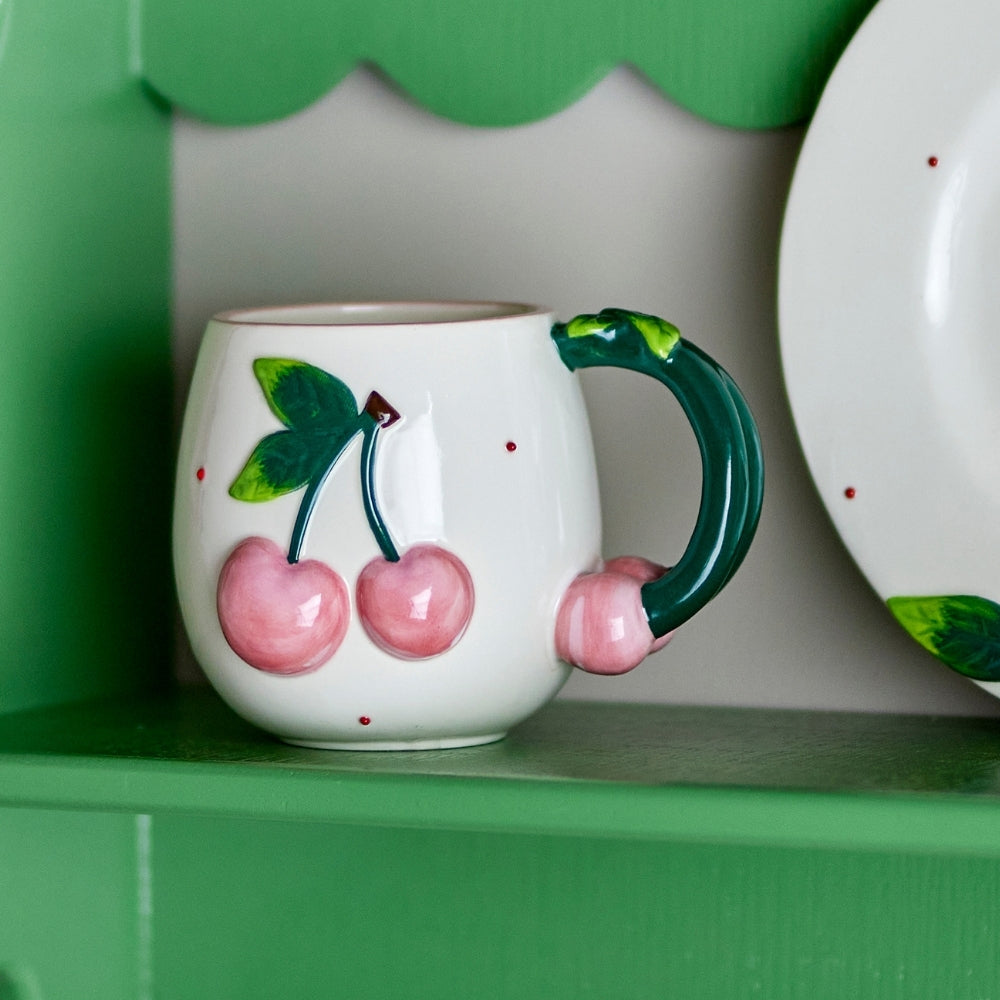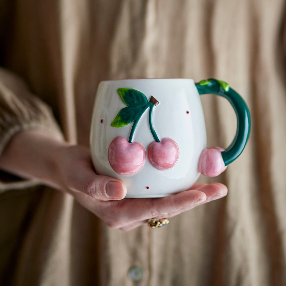 Tento jedinečný kameninový hrnek zaujme svým zaobleným tvarem, krémovým povrchem a ručně malovaným motivem růžových třešní.