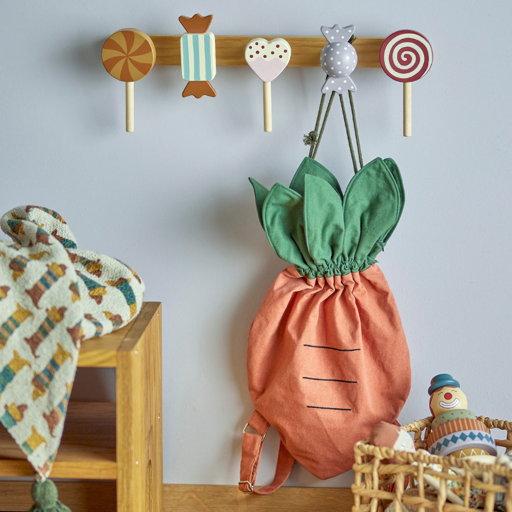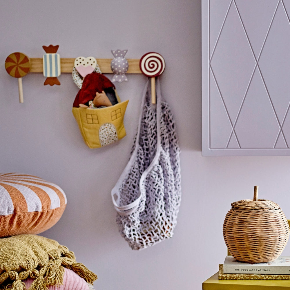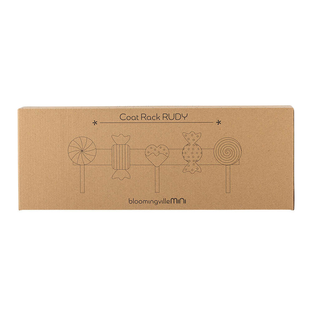 Věšák Rudy od společnosti Bloomingville je rozkošný doplněk do dětského pokoje, který okamžitě upoutá pozornost barevnými bonbóny a lízátky.