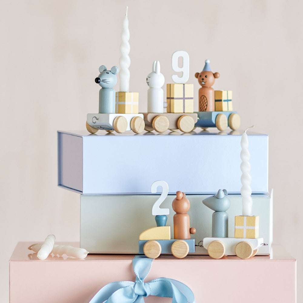 - Obsah sady: narozeninový vlak s 5 vagónky, čísla 0-9, prvek s prostorem pro 3 svíčky.