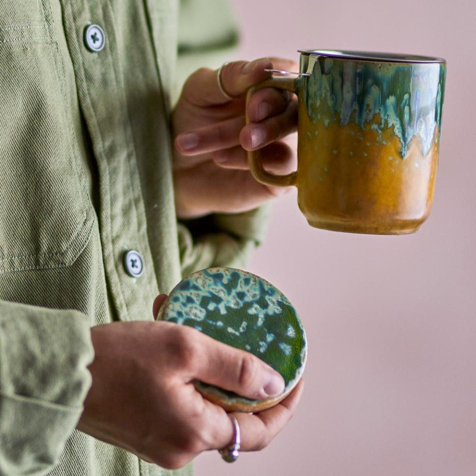 Díky glazuře se každý hrnek na čaj liší odstíny teplých zemitých tónů a světlých perleťových odstínů.