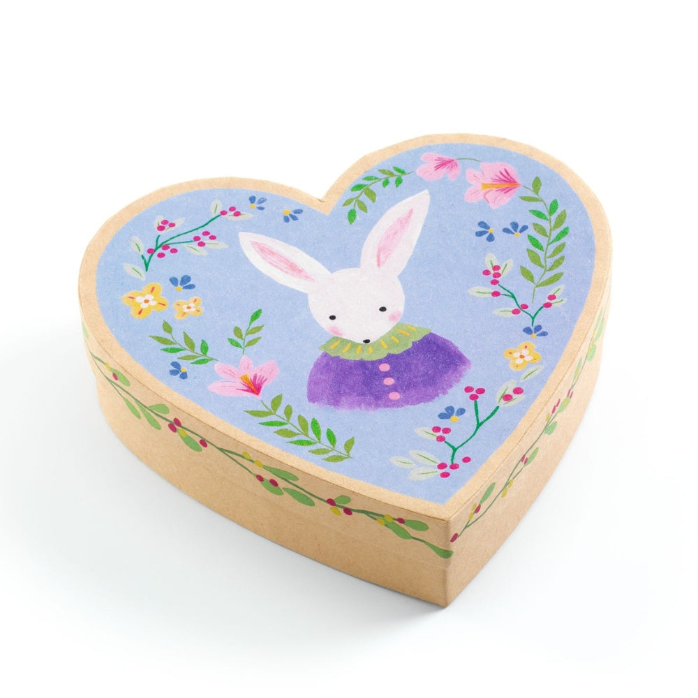 Uvnitř na vás čeká krásná krabička ve tvaru srdce, kterou Djeco ozdobilo ilustrací roztomilého zajíčka.