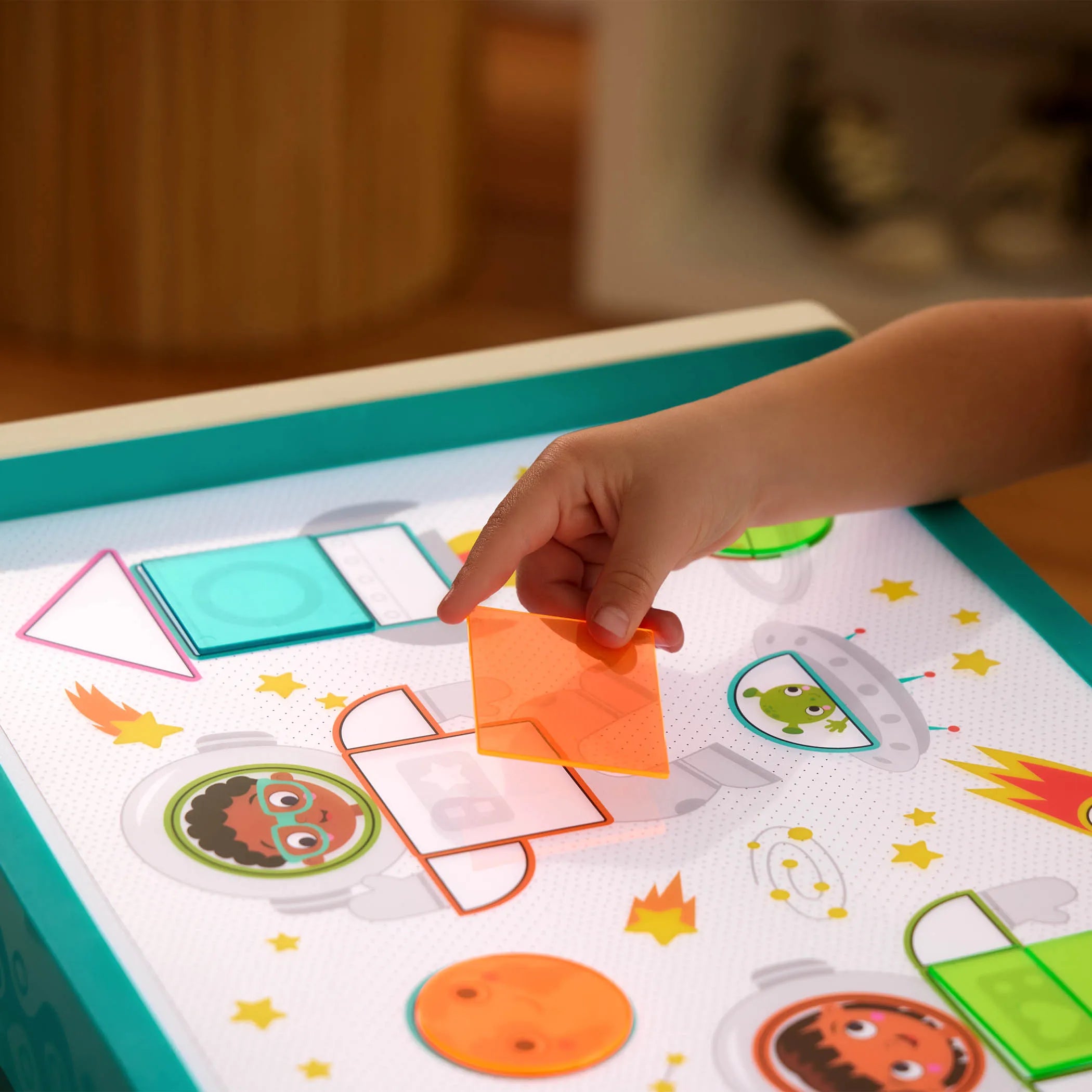 Díky pěti barvám podsvícení a dvěma úrovním jasu každá kresba ožije, zatímco 50 průhledných tvarů, 10 3D čísel a šablon umožňuje experimentovat s vrstvením barev, kompozicí a prvním počítáním.