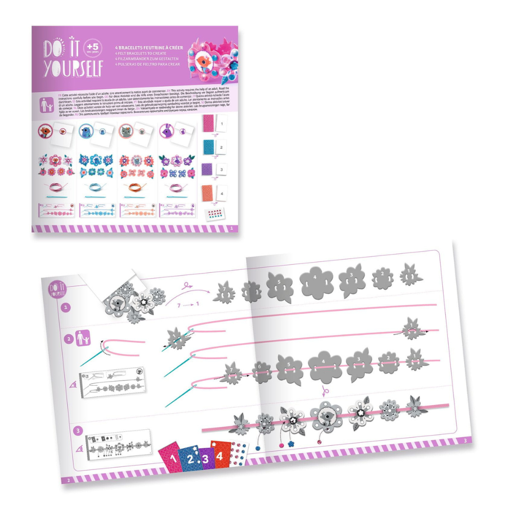 V krabici najdete vše, co potřebujete k vytvoření 4 krásných náramků přátelství: měkkou plsť na dotek, lesklé pěnové samolepky a samolepky ve tvaru barevných "kamínků".