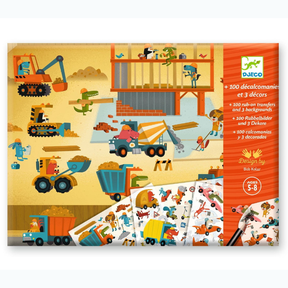 Sada obtisků Djeco zavede děti na staveniště, do ulic města a na závodní dráhu.