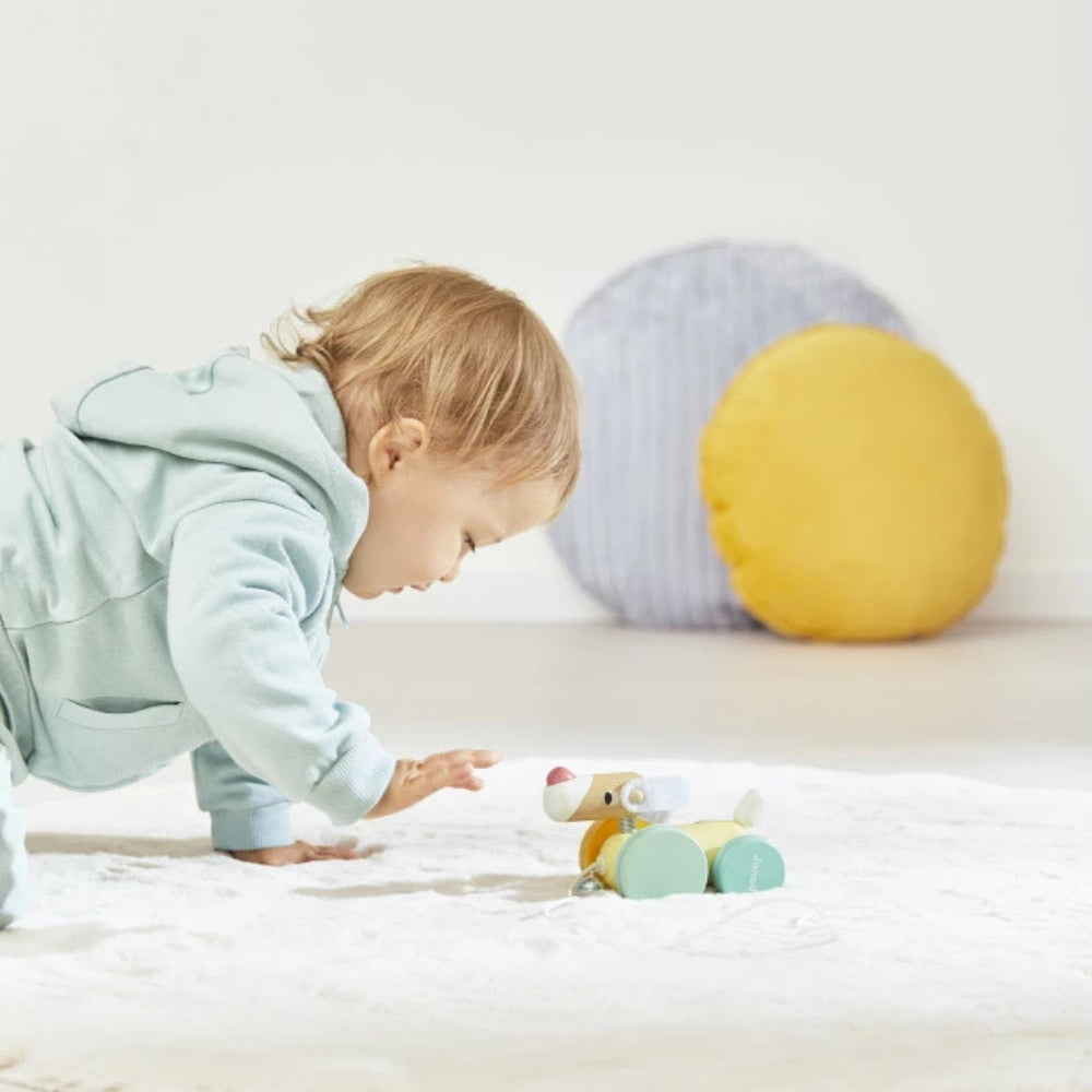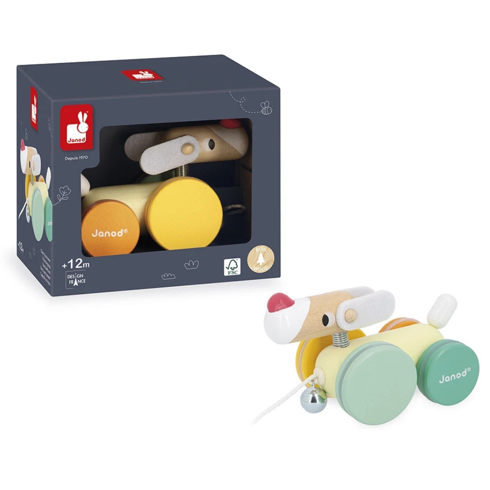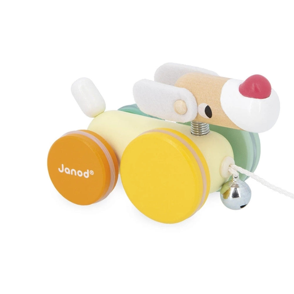 Tahací hračka Janod je rozkošný barevný pejsek na kolečkách, který se rychle stává oblíbeným společníkem na malých procházkách.