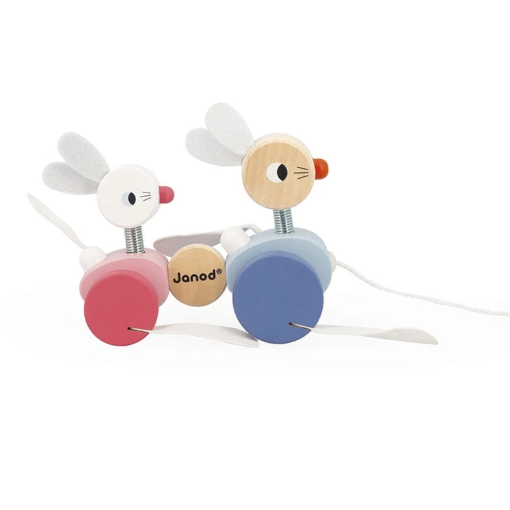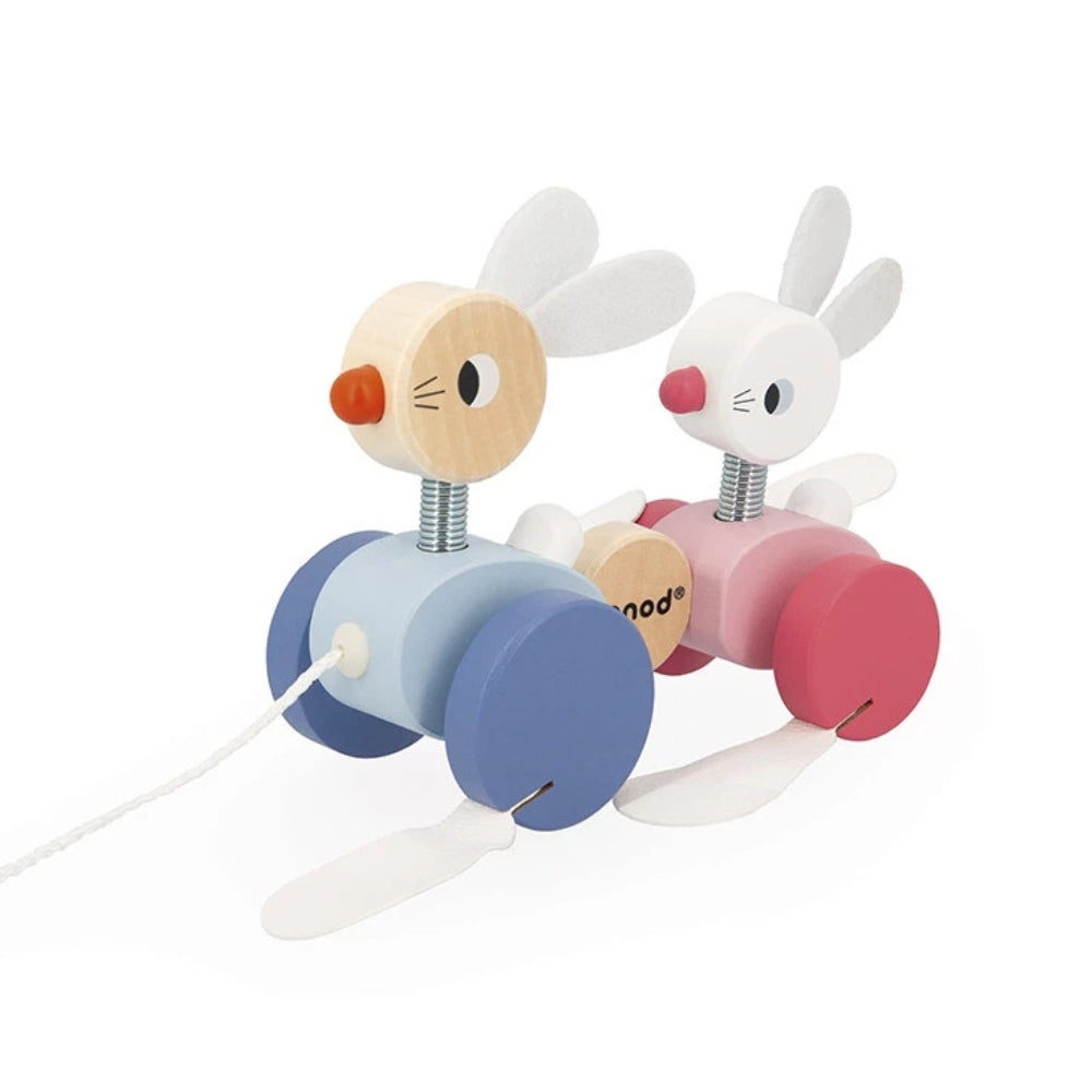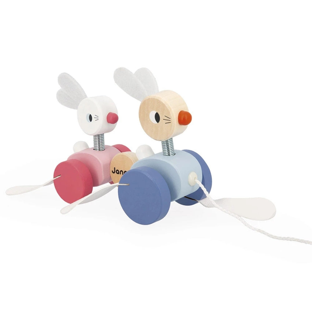 Tahací hračka Janod je rozkošná rodinka králíčků, kterou si batole může vzít kamkoli s sebou.