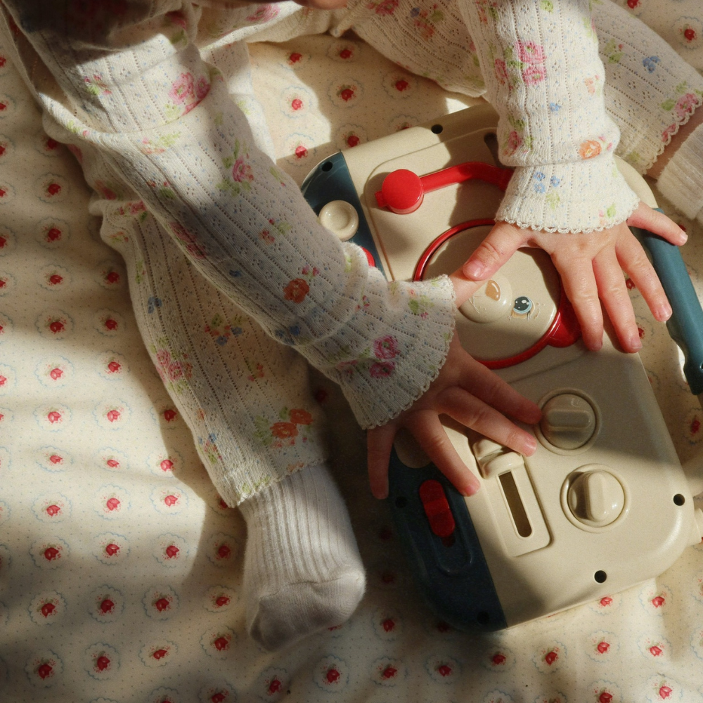 Dětské rádio má tlačítka ke stisknutí, číselníky k otáčení a zábavné zvukové efekty, takže podporuje dítě v objevování příčin a následků a procvičování jemné motoriky.