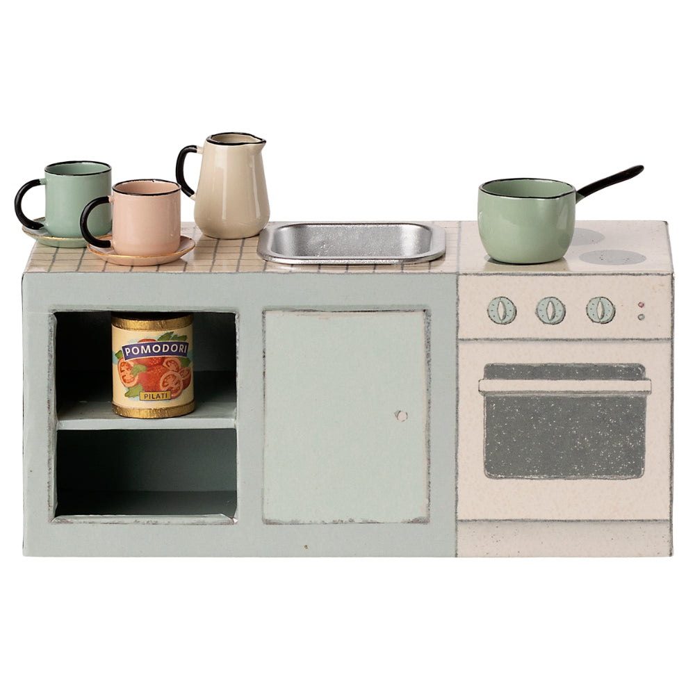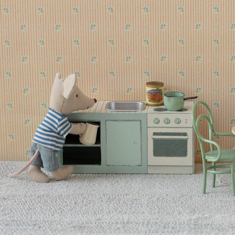 Součástí miniaturní stolní desky je také kovový dřez, který vypadá jako skutečný, což dále podněcuje představivost a činí hru ještě poutavější. Značka Maileg je proslulá svým smyslem pro detail, takže každý kus této sady byl navržen tak, aby dokonale zapadl do kuchyně myšího domečku SuitCasa.