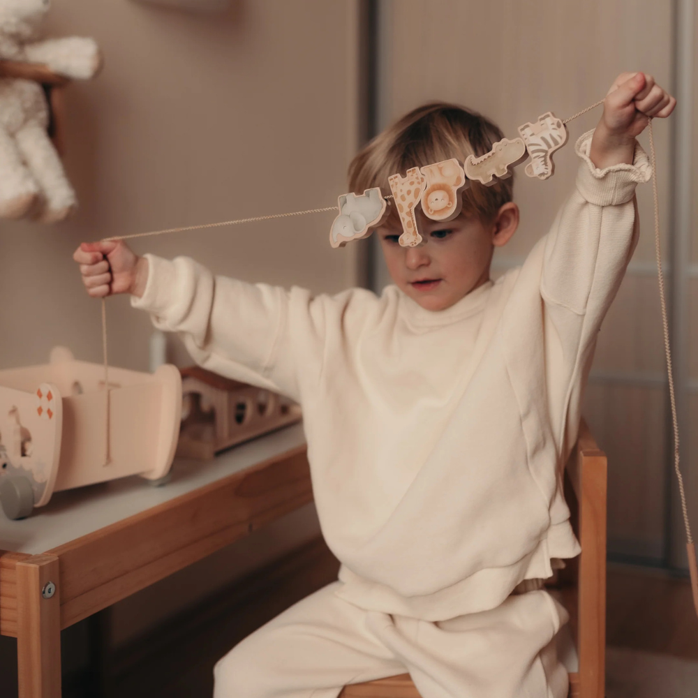 Sada obsahuje až 22 dílků: 14 zvířátek, duhu, žebříkovou rampu, loďku na kolečkách a provázek s dřevěnou špičkou na provlékání figurek.