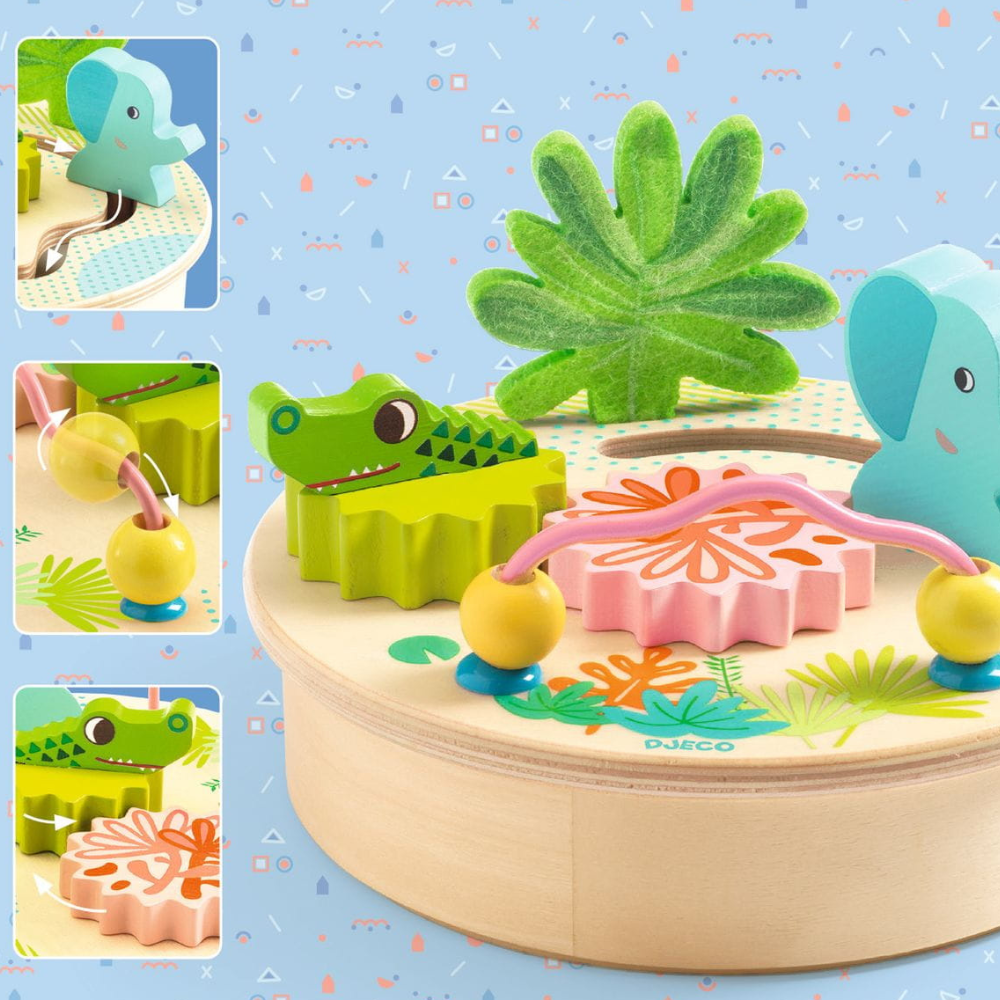 Na kulatém stolečku najdete posuvné korálky, slona, který se schovává za keři, a krokodýlí ozubená kola.