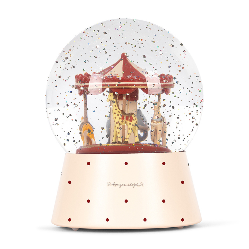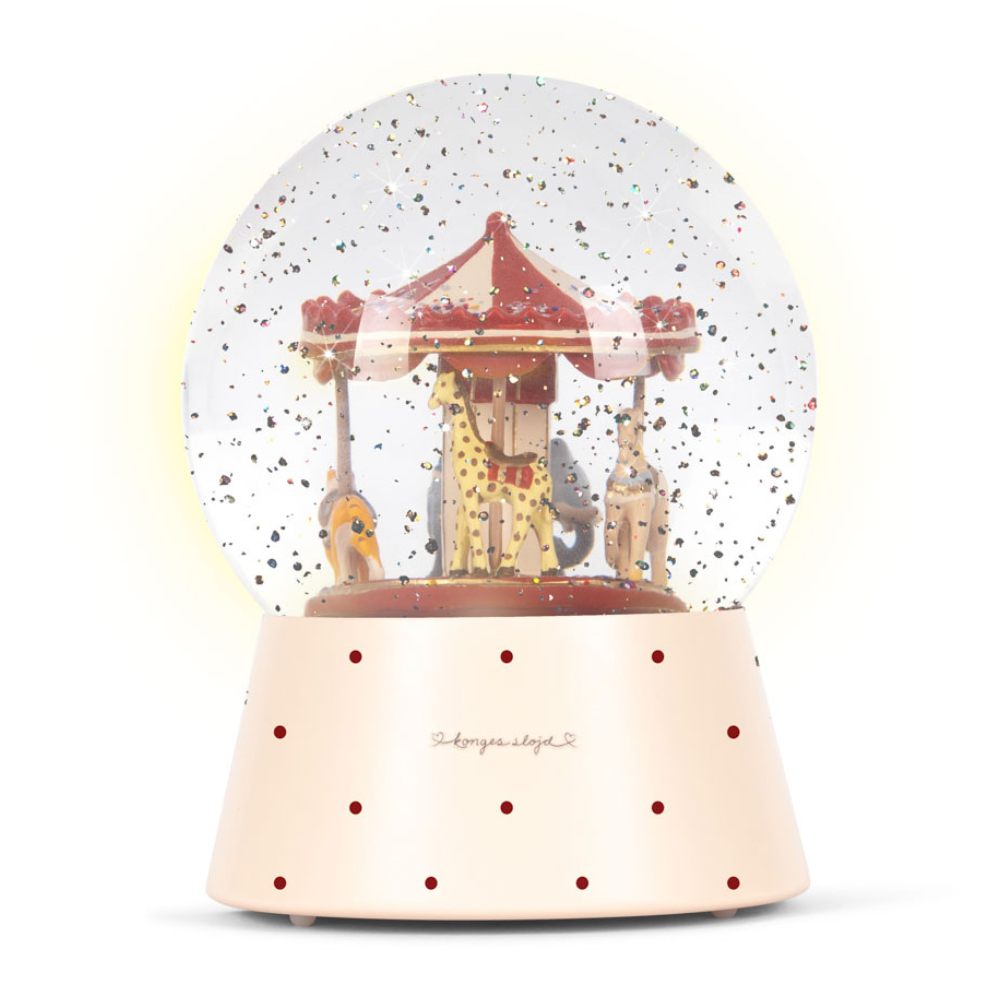 Skleněná koule s kolotočem od společnosti Konges Slojd je krásně propracovaná dekorace, která rozzáří dětský pokoj a navodí uklidňující atmosféru před spaním. Jemné zatřesení spustí tanec třpytek a praktická funkce světla umožňuje použití také jako náladová noční lampička.