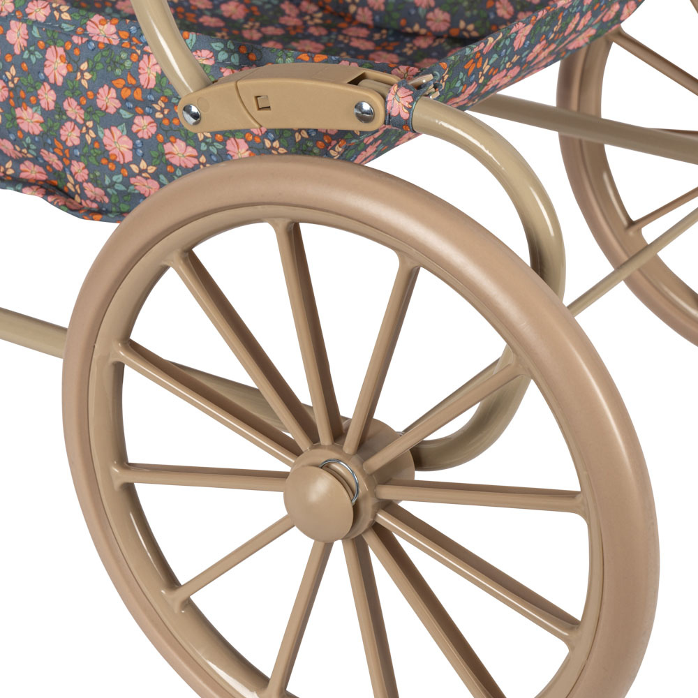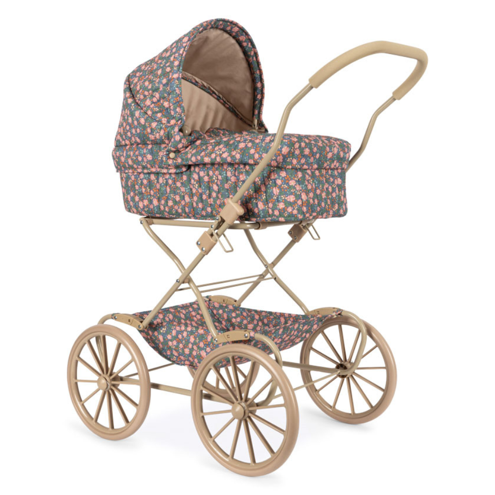 Tento elegantní kočárek pro panenky přenáší zábavu do světa vintage stylu: čtyři velká kola, měkce prošívaná látka, jemné vlnkované lemy a pohodlná matrace vytvářejí útulný prostor pro vaši oblíbenou panenku.