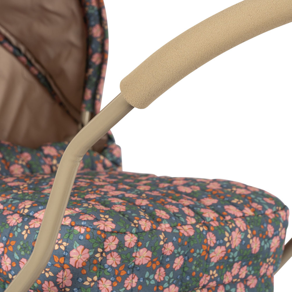 Pod kočárkem se nachází praktický košík na drobnosti a kovový rám s měkkými, heboučkými rukojeťmi poskytuje bezpečné a pohodlné uchopení.