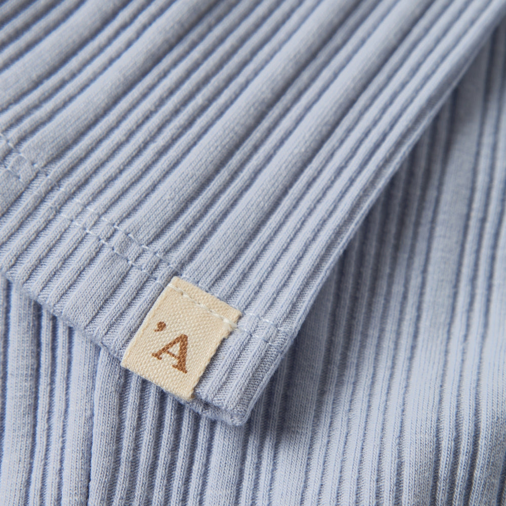 Jemný volánek dodává dívčí nádech a tlumená modrá barva se hodí jak ke každodennímu vzhledu, tak k elegantnějším kompletům.