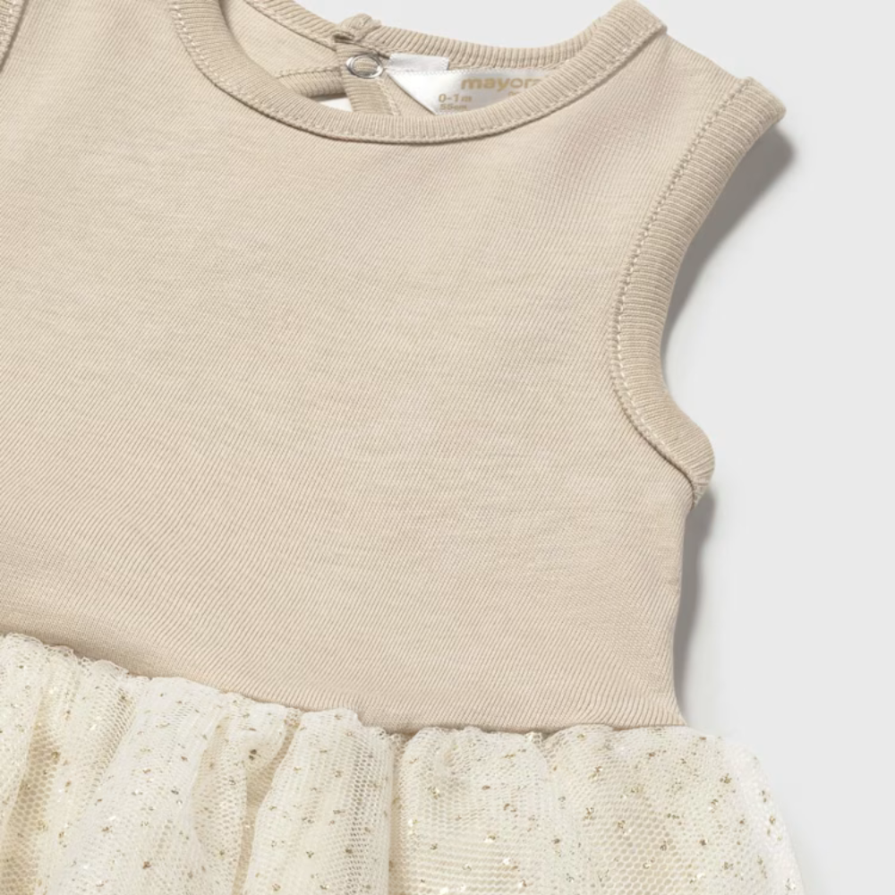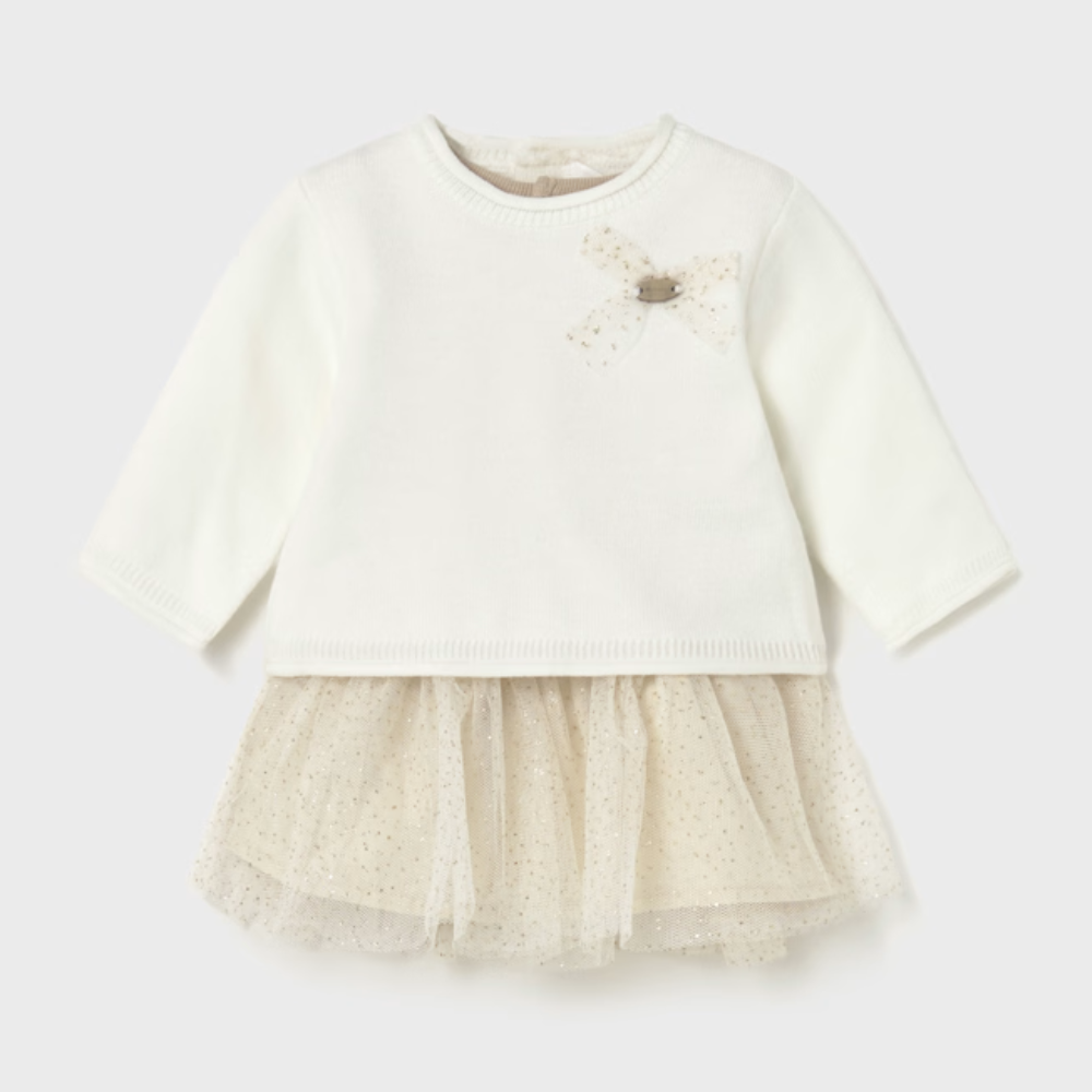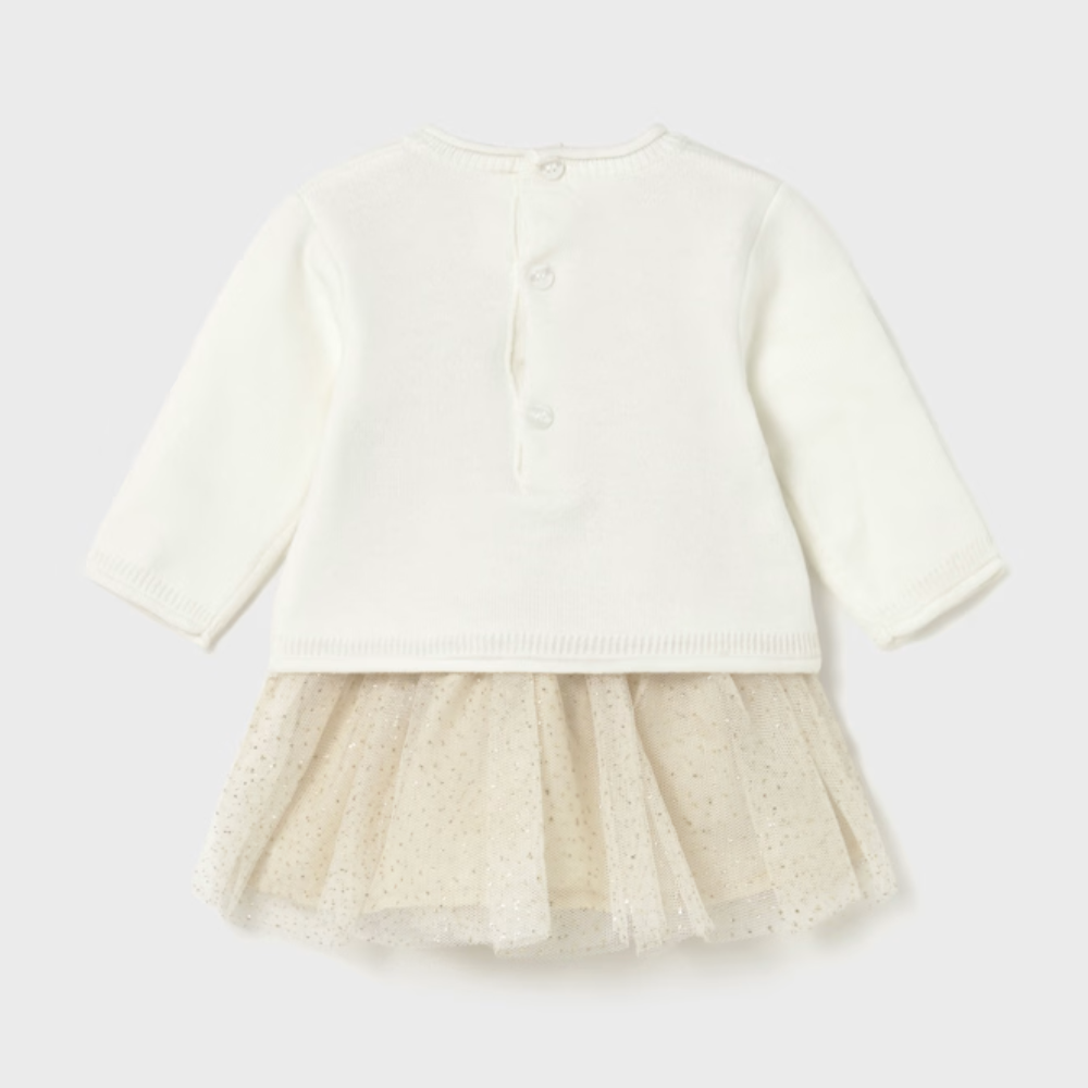 Tato rozkošná souprava od společnosti Mayoral kombinuje měkký svetřík na knoflíky s lehkými šatičkami bez ramínek s tylem - ideální souprava pro rodinné výlety a zvláštní příležitosti.
