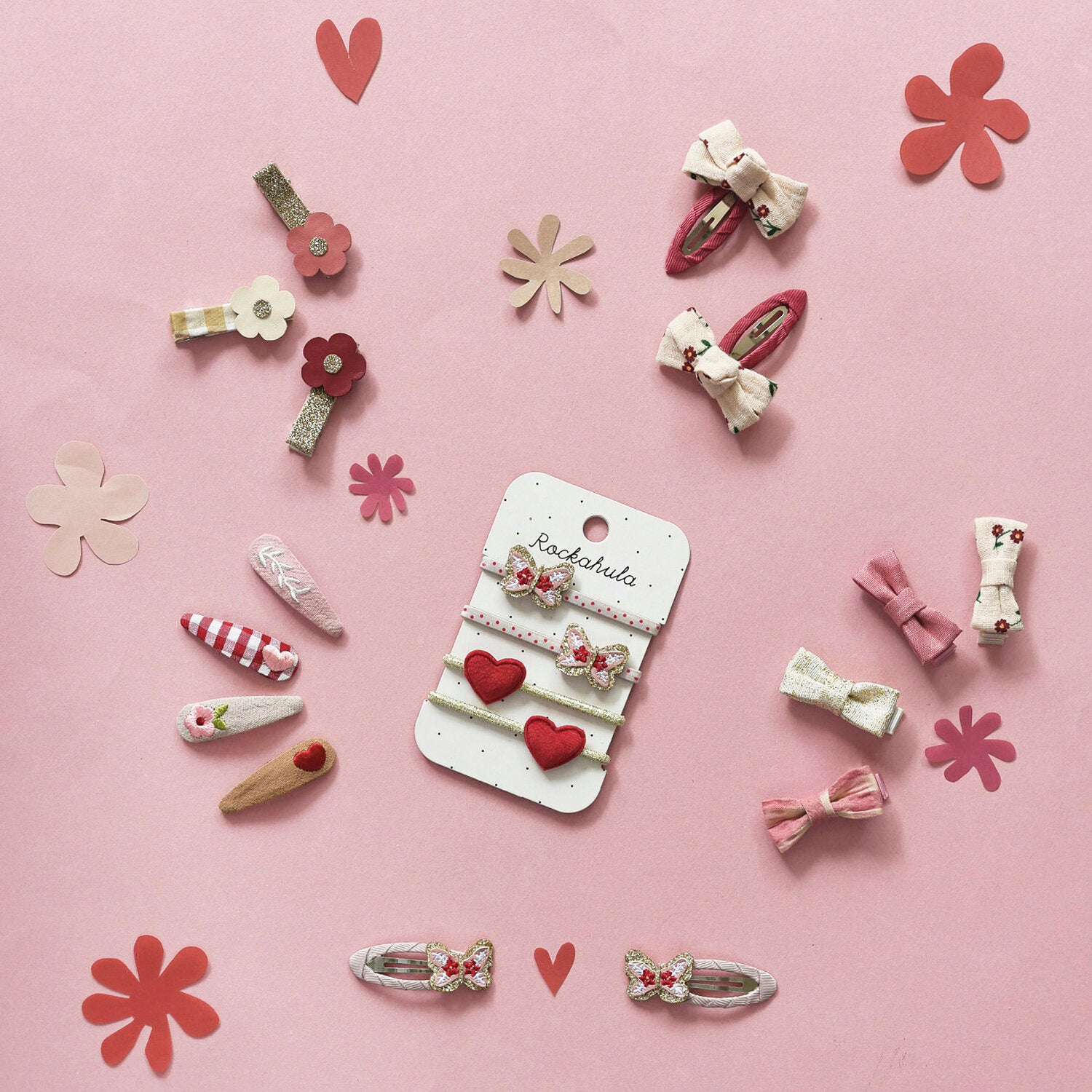 Sada Rockahula obsahuje čtyři ozdobné gumičky do vlasů: dvě s lidovými motýlky na puntíkovaných gumičkách a dvě s červenými sametovými srdíčky na zlatých gumičkách.