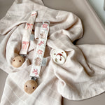 Elegantní klip z přírodního dřeva a kovu bez obsahu niklu umožňuje bezpečné připevnění přívěsku na oblečení dítěte a chrání dudlík před pádem a ušpiněním.