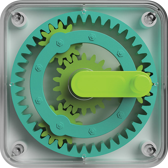 Díky mechanismu aktivovanému klikou může batole sledovat, jak velké kolečko pohybuje třemi menšími kolečky, což mu přináší spoustu uspokojení a podporuje experimentování.