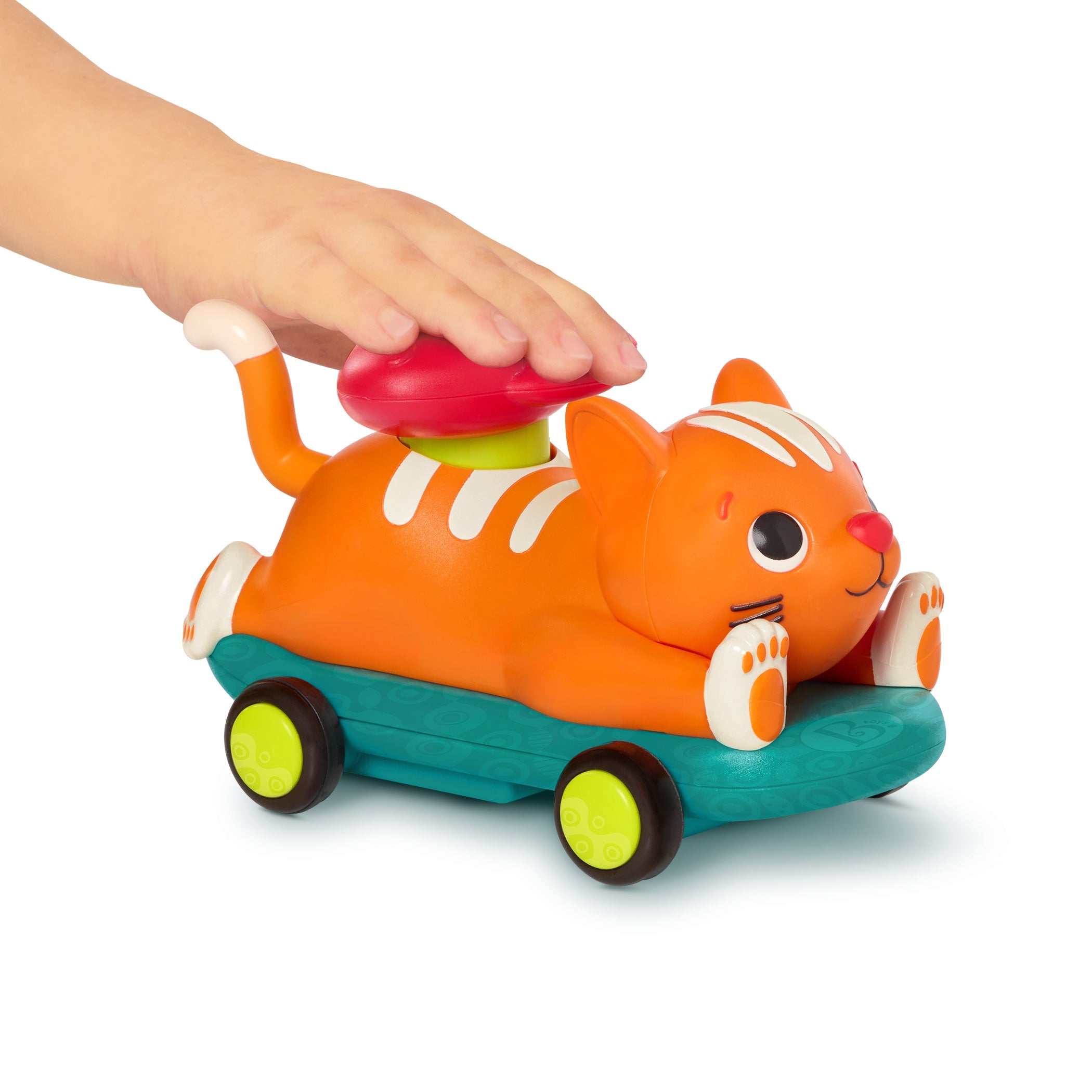 Autíčka B.Toys PawMobiles Push&,Go jsou duo plné energie: stačí stisknout vozidlo shora a pejsek s kočičkou se vydají na cestu a vrtí ocásky.
