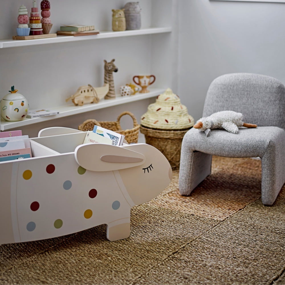 Vypadá jako přátelský králíček v puntíkovaném svetříku, díky čemuž je knihovnička nejen praktická, ale také dekorativní.