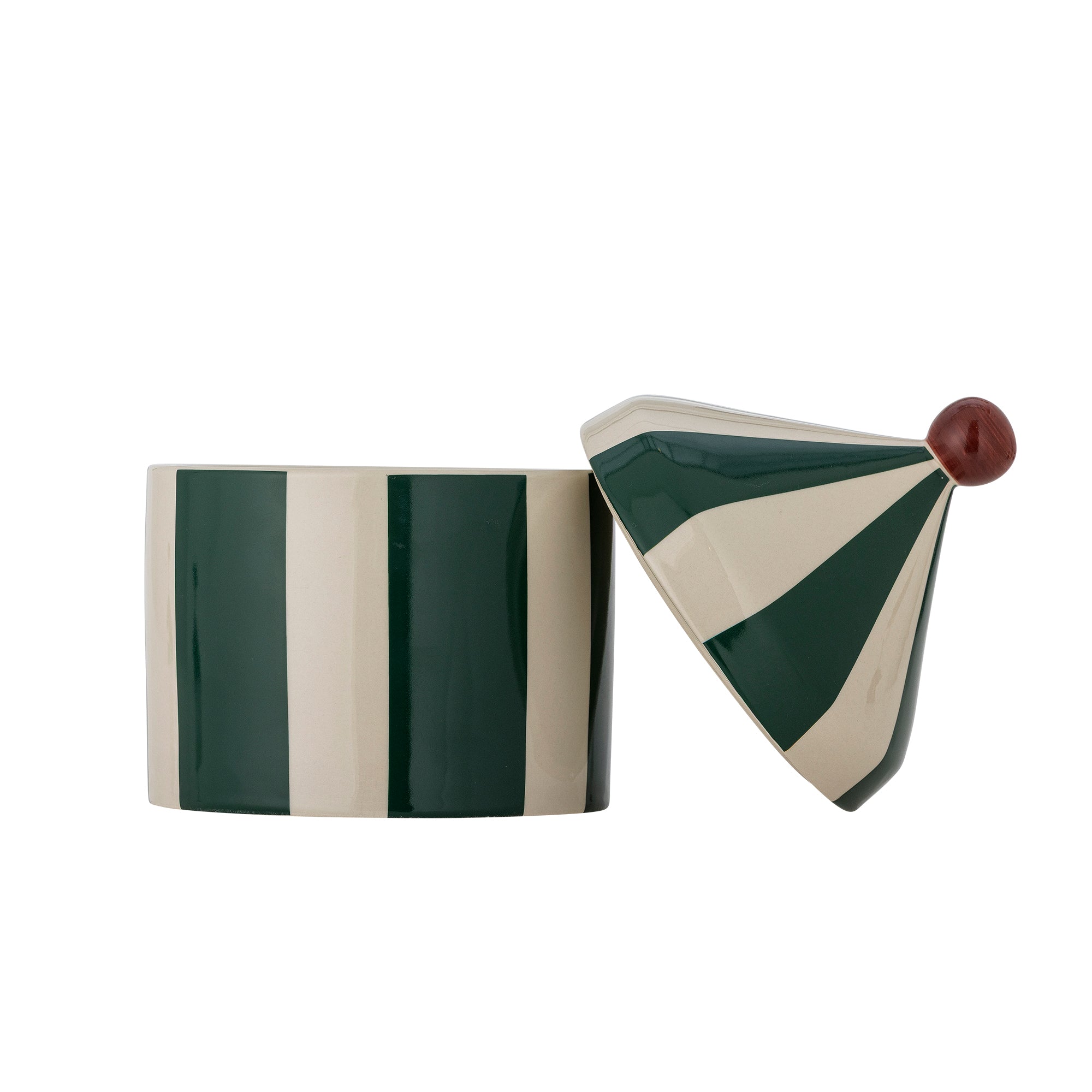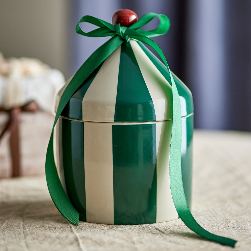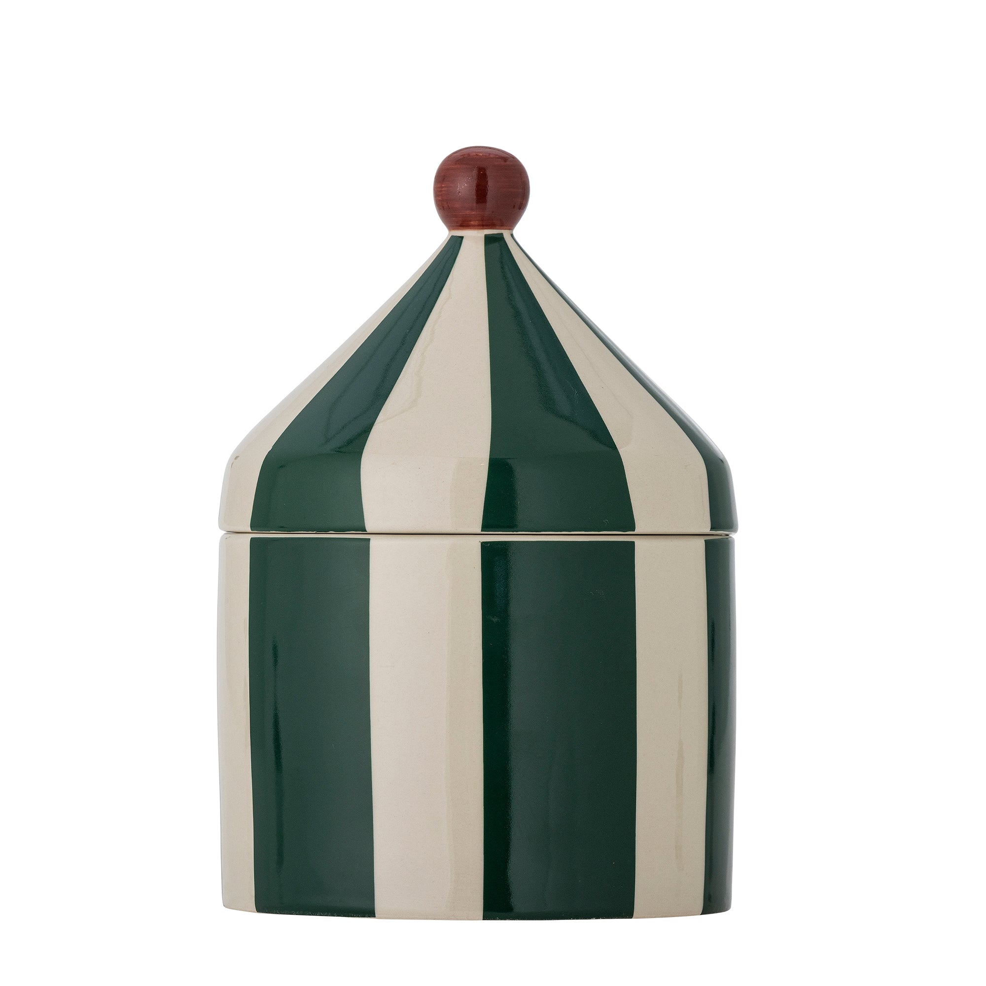 Úložná nádoba má roztomilý tvar cirkusového stanu a je vyrobena z kameniny s modrými a bílými pruhy.