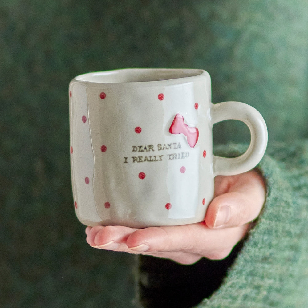 Okouzlující nápis "Milý Santo, opravdu jsem se snažil" a ručně malované červené detaily dělají z každého hrnku jedinečný kousek.