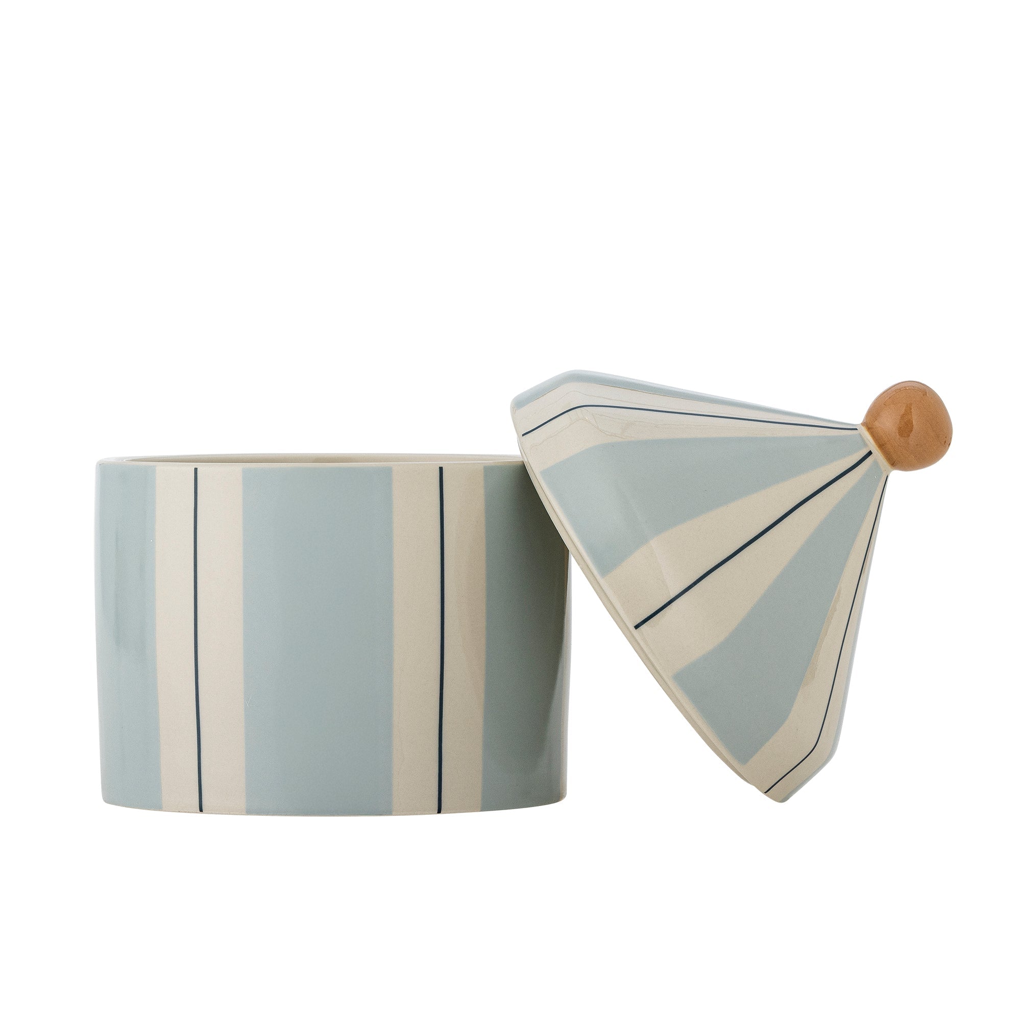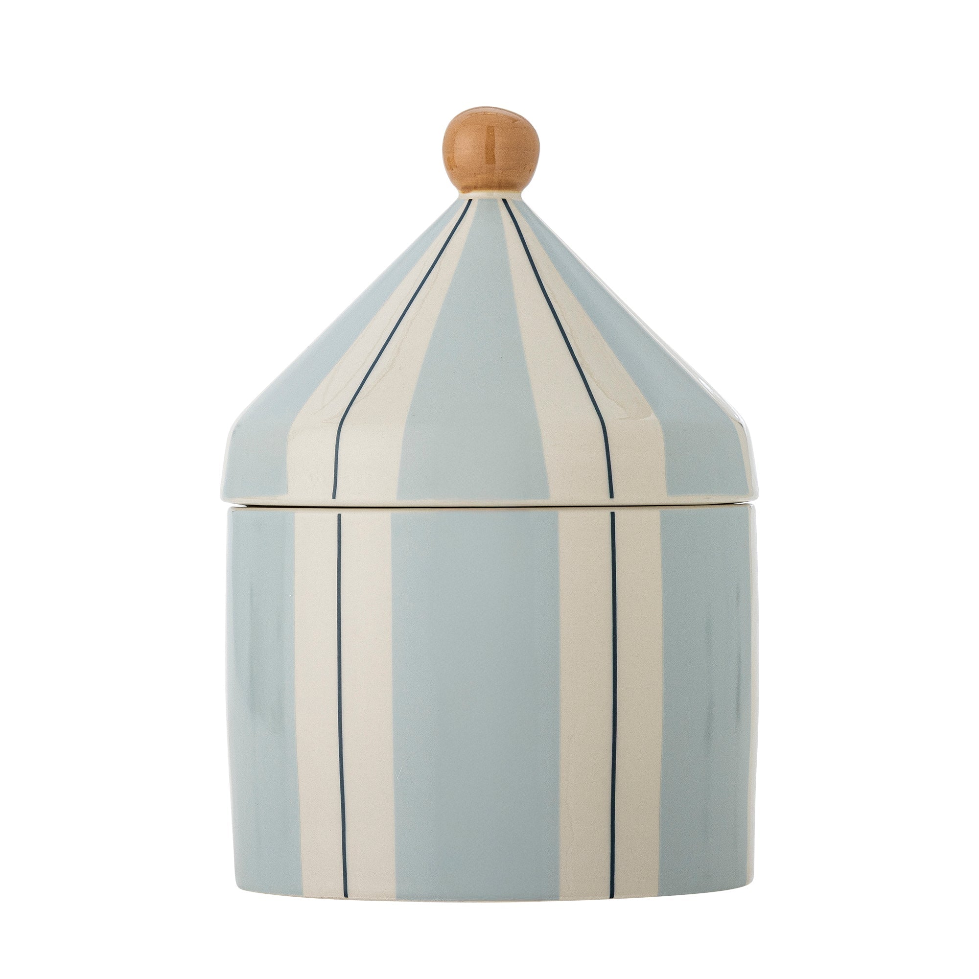 Úložná nádoba má roztomilý tvar cirkusového stanu a je vyrobena z kameniny s modrými a bílými pruhy.
