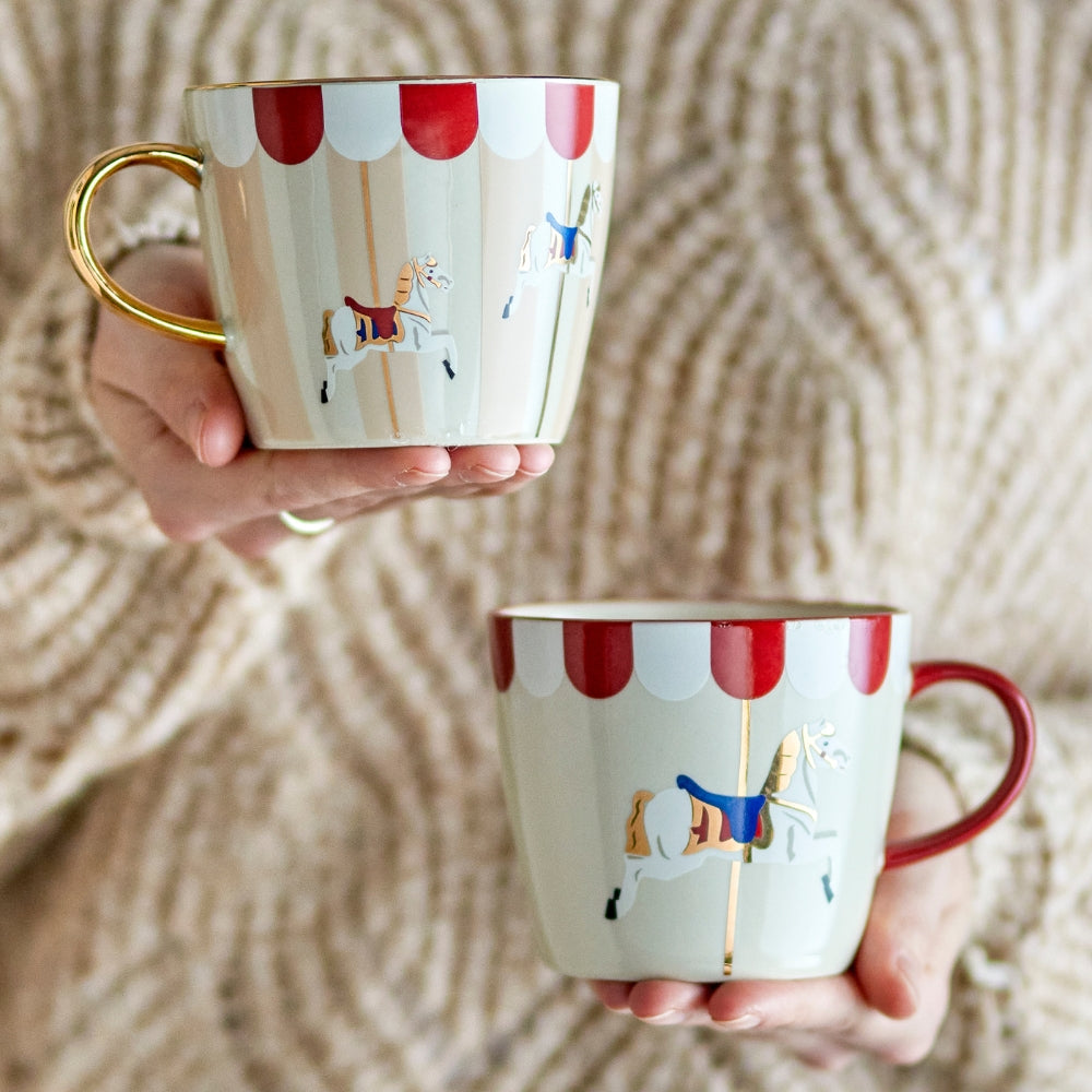 Každý hrnek na kávu byl ozdoben motivem kolotoče a díky ručně malovaným detailům je každý kus jedinečný.