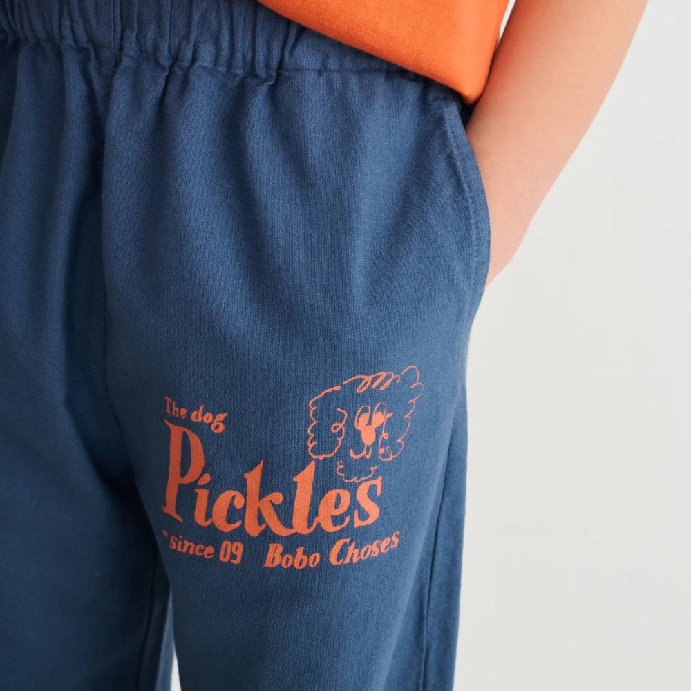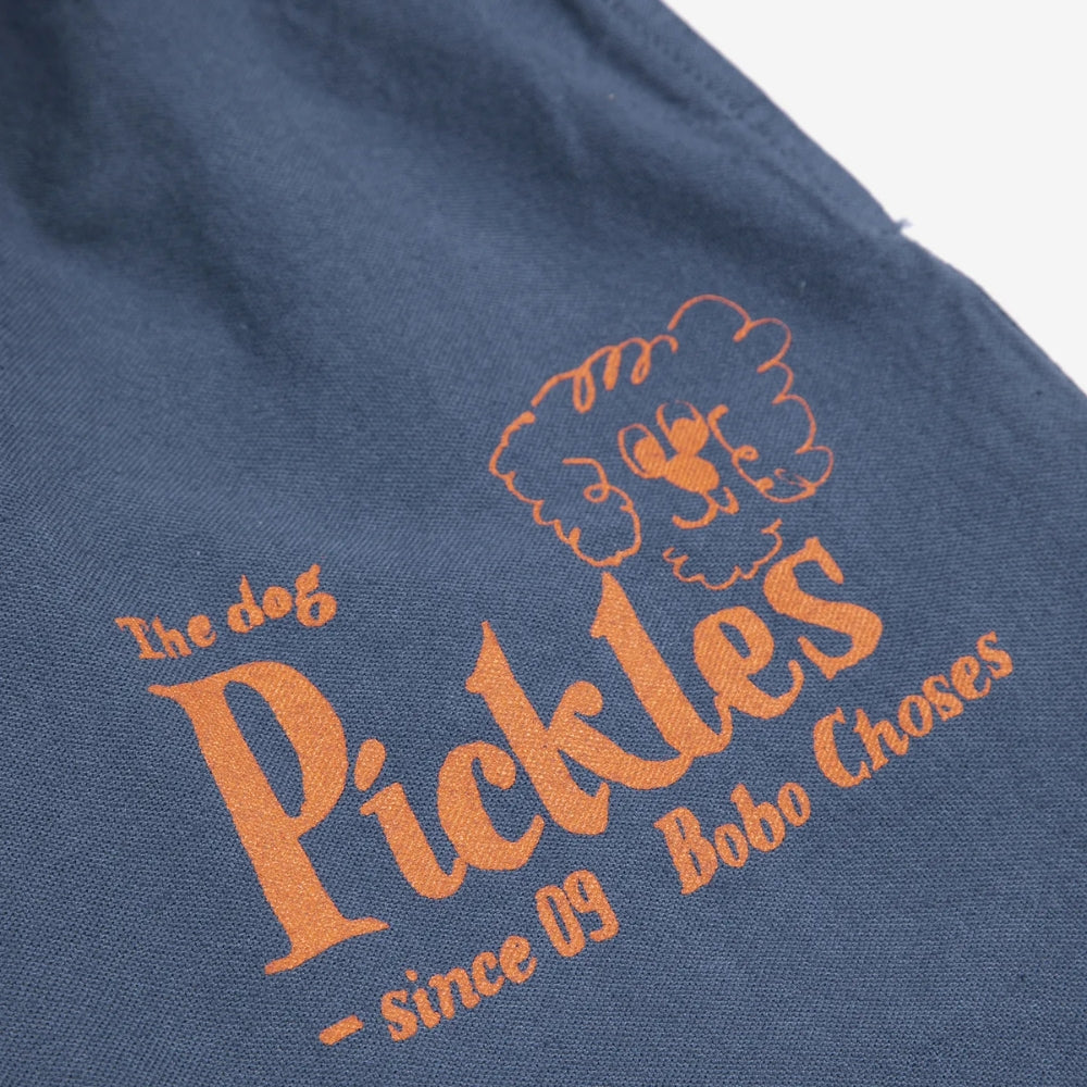 Tmavě modrá barva v kombinaci s výrazným potiskem "Pickles the Dog" dodává celkovému vzhledu jedinečný, umělecký nádech, kterým je značka Bobo Choses známá.