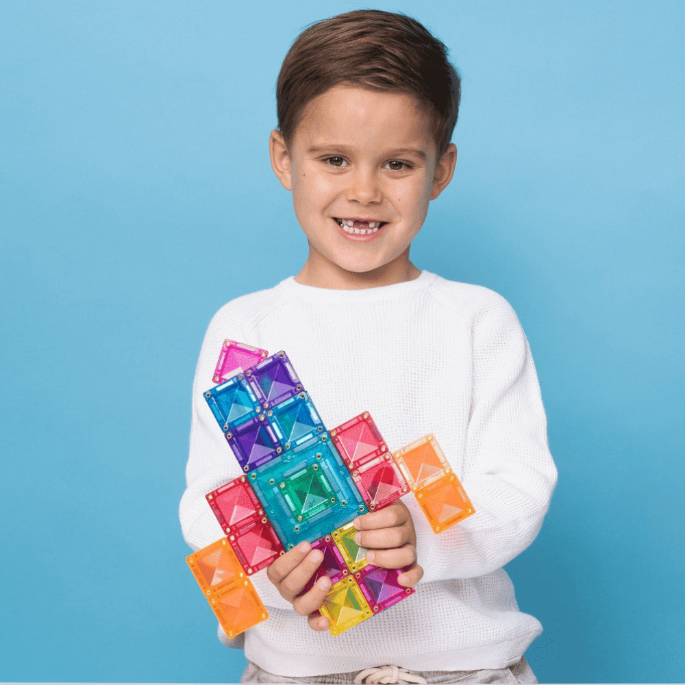 Sada portálů s baterkou a projektorem od společnosti Connetix jsou magnetické kostky v osmi zářivých barvách a třech velikostech čtverců, které se chytře vkládají jeden do druhého.