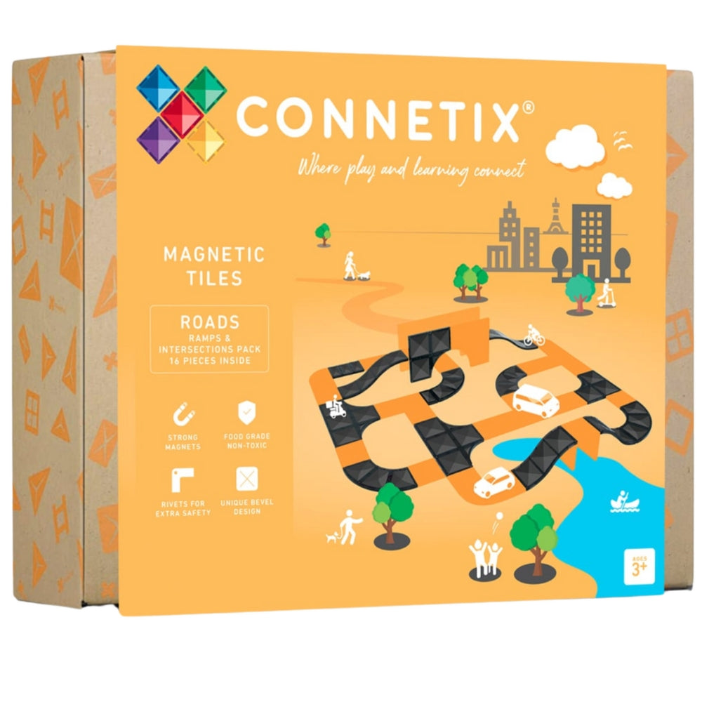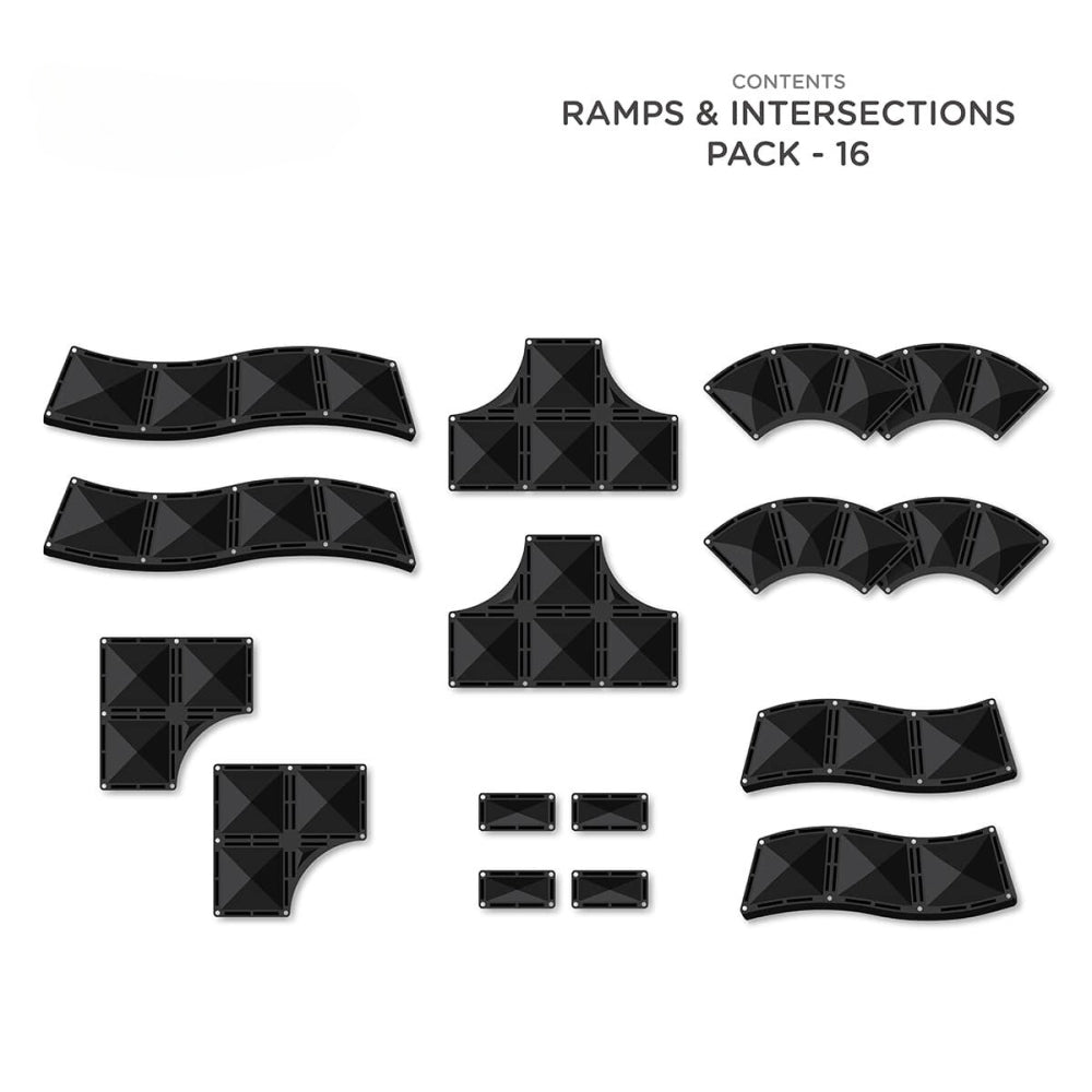 Sada 16 dílků silnic, ramp a křižovatek od společnosti Connetix obsahuje jedinečné tvary magnetických kostek inspirované silnicemi, včetně čtvrtkruhů, zatáček, křižovatek a dlouhých a krátkých ramp, to vše v elegantním černém odstínu.