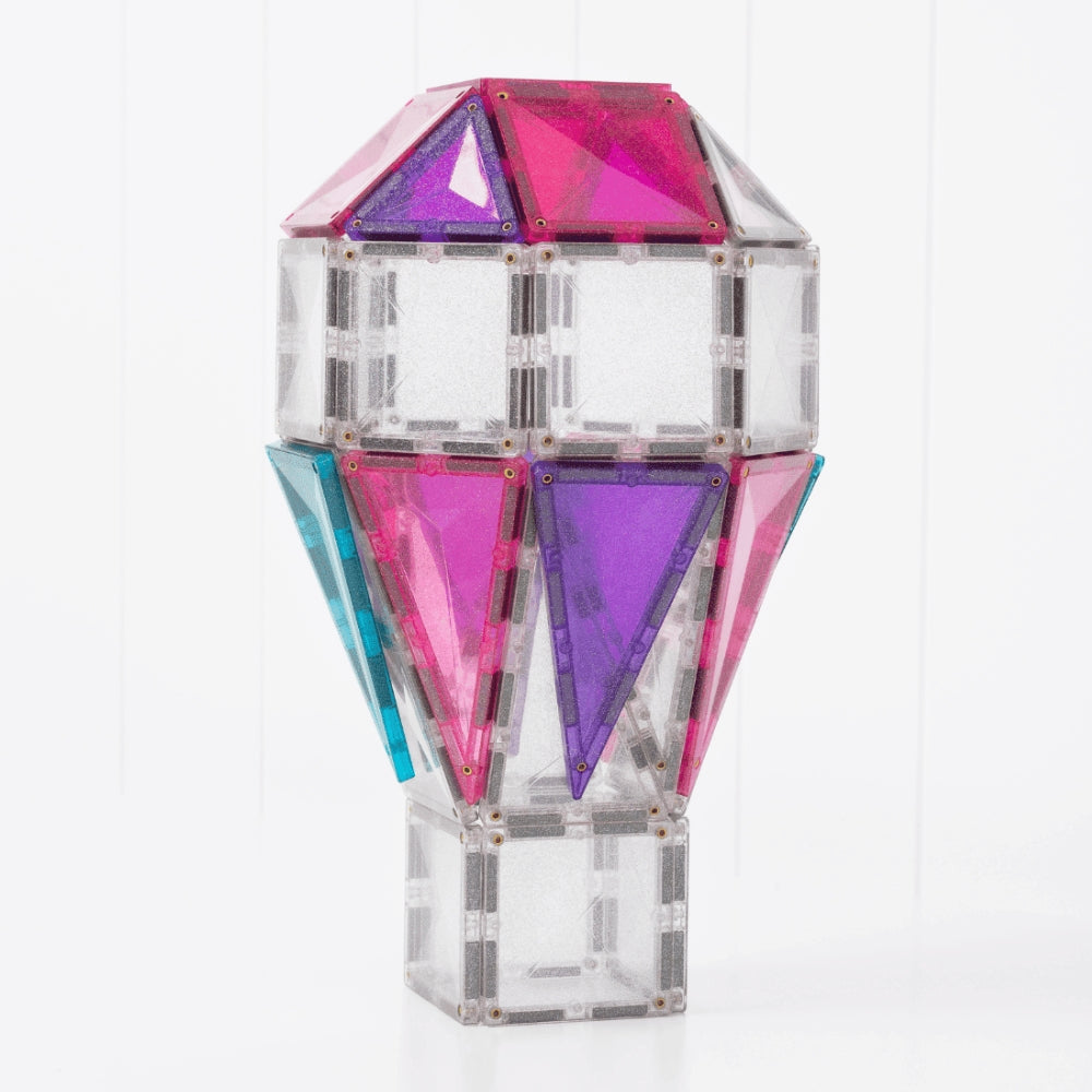Tyto třpytivé magnetické kostky v nádherných průsvitných odstínech růžové, žluté, tyrkysové a fialové barvy umožňují vytvářet třpytivé hrady, zvířátka nebo dekorace na narozeninovou oslavu ve stylu jednorožců - na stěnu, strop nebo při světle baterky.