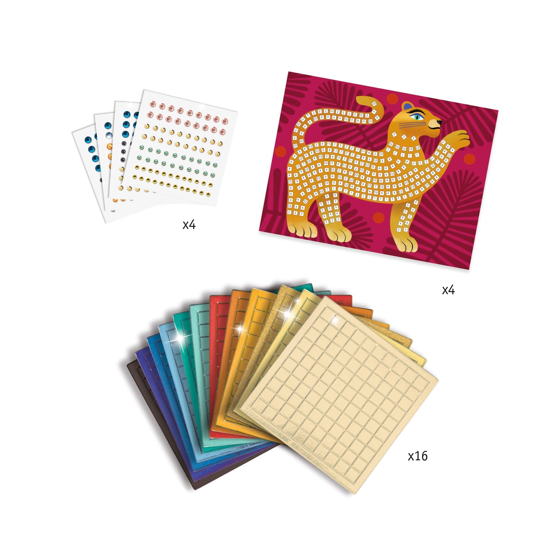 - Obsah sady: Sada: 4 šablony, 16 desek s pěnovou a třpytivou mozaikou, 4 listy se zirkony.