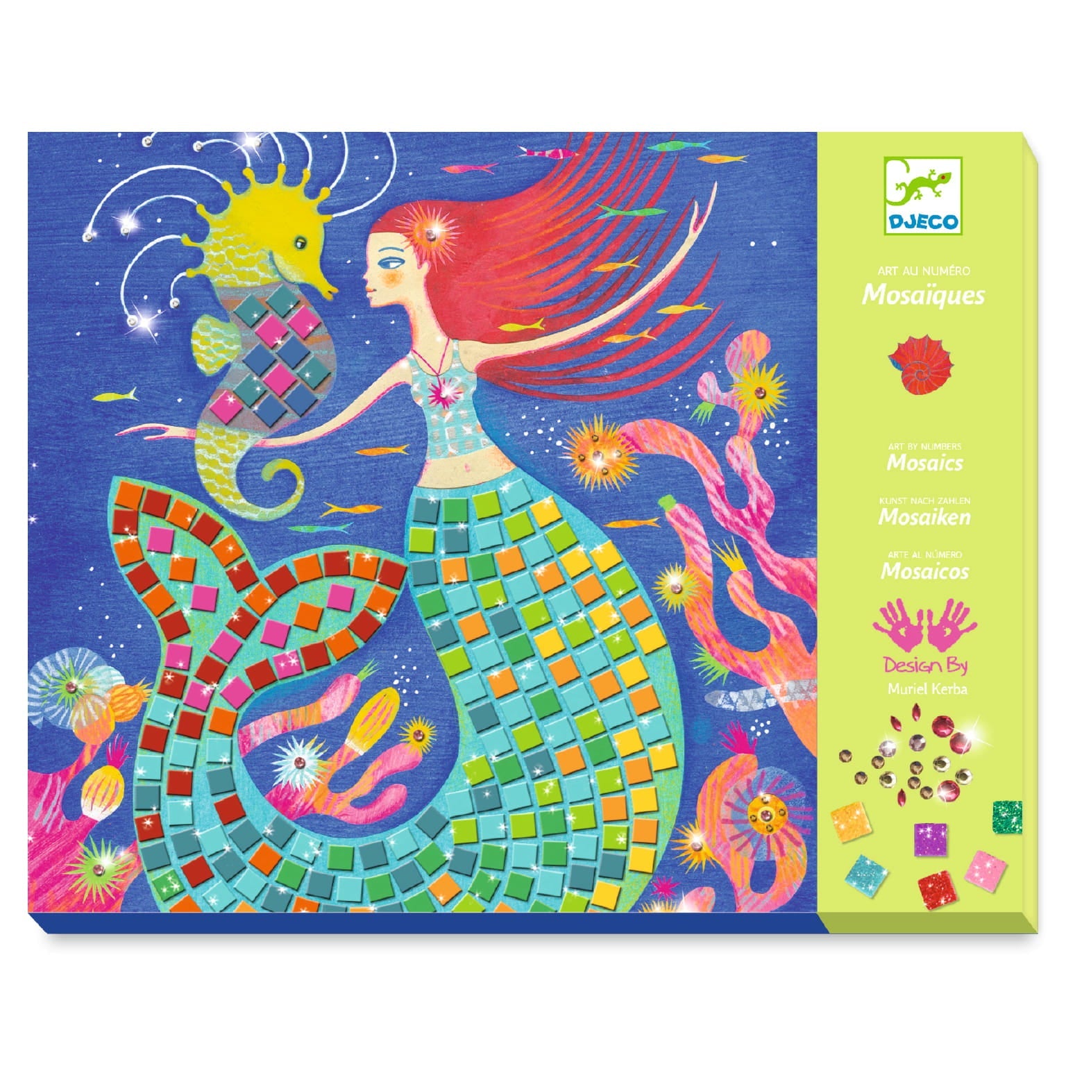 Se sadou Djeco si dítě krok za krokem vytvoří zářivé ilustrace mořských panen a nalepí barevné pěnové mozaiky a zirkony podle čísel uvedených na deskách.