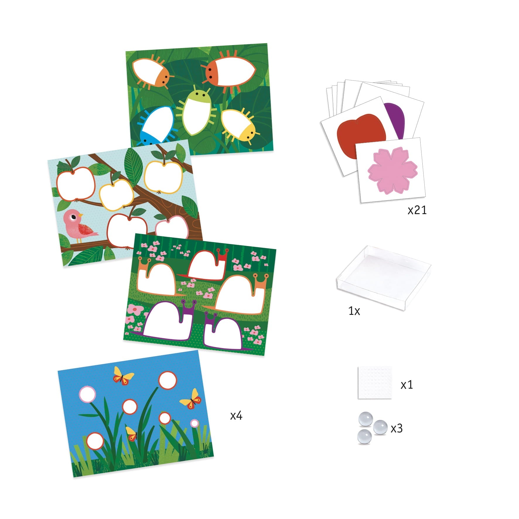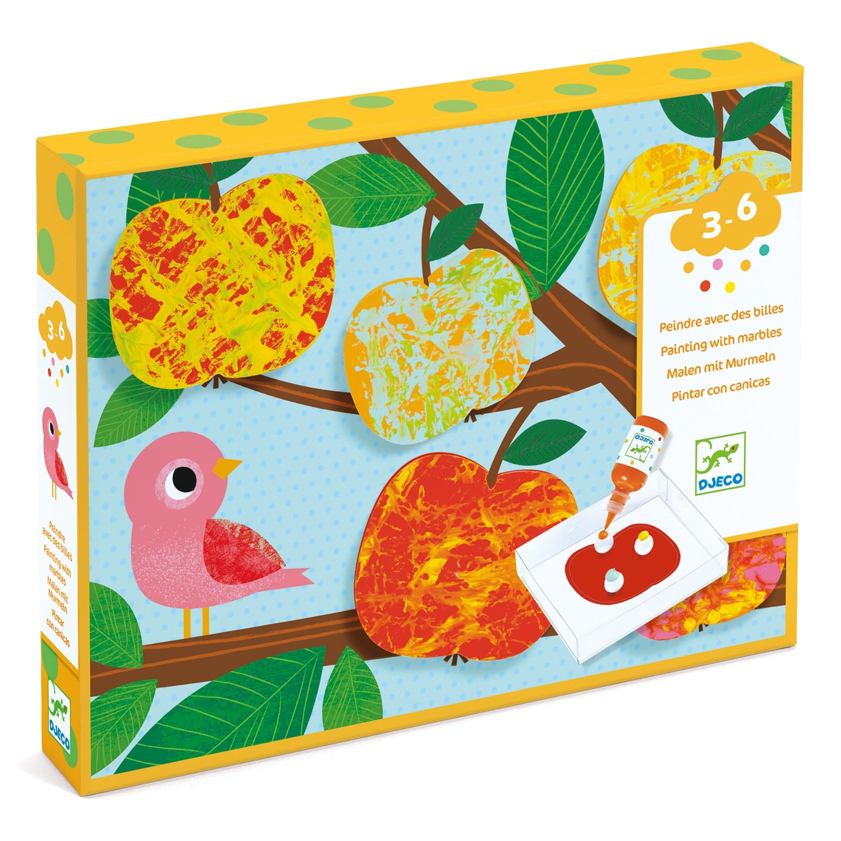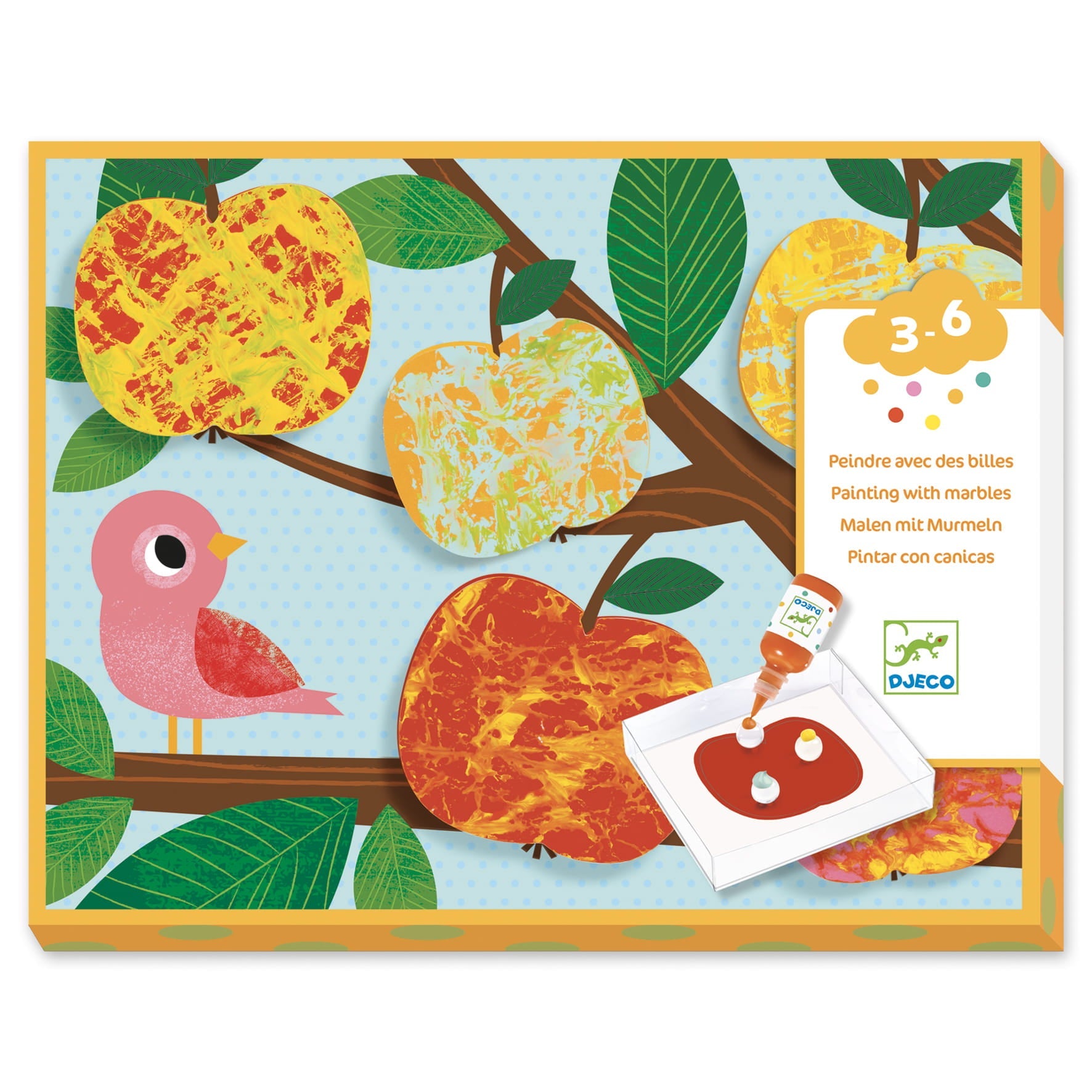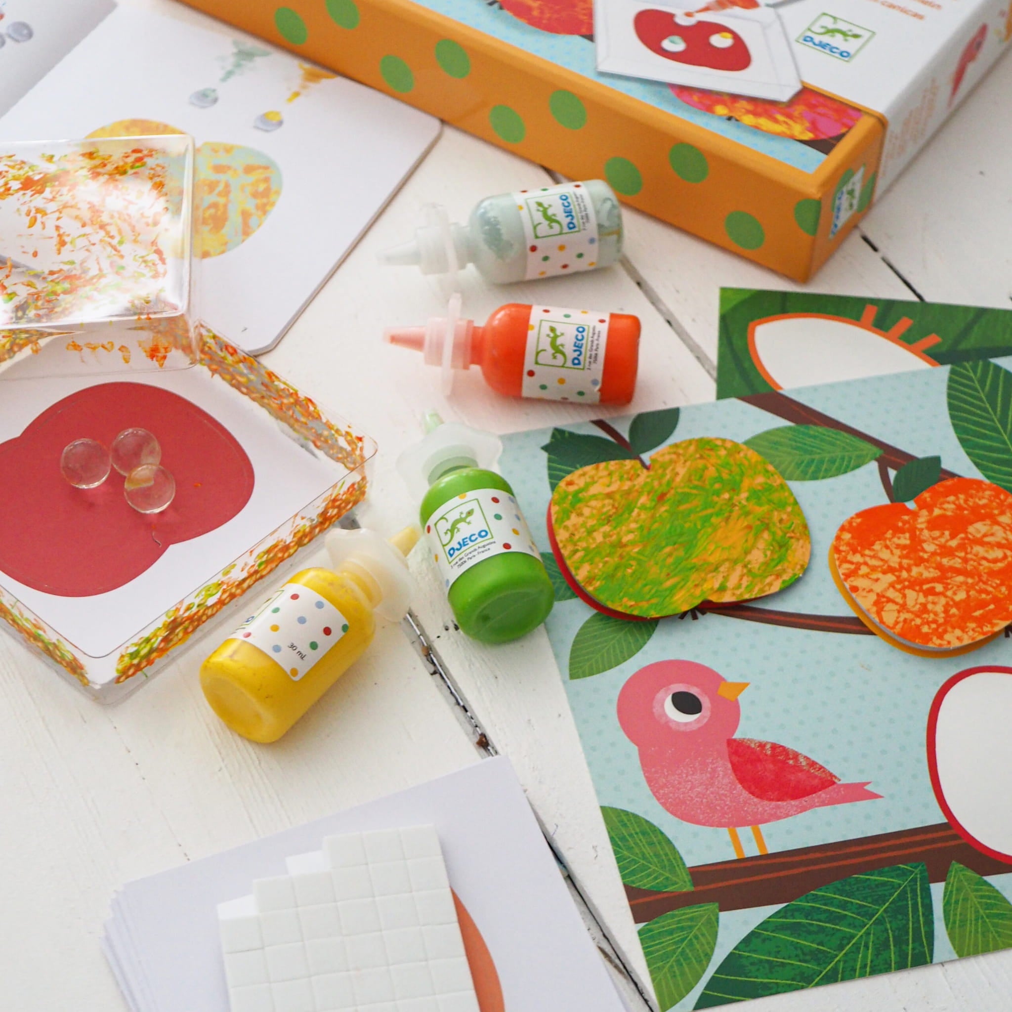 Výtvarná sada Djeco je skvělým nápadem pro kreativní hru, při které dítě vytváří obrázky neobvyklým způsobem - malováním skleněnými kuličkami a barvami.