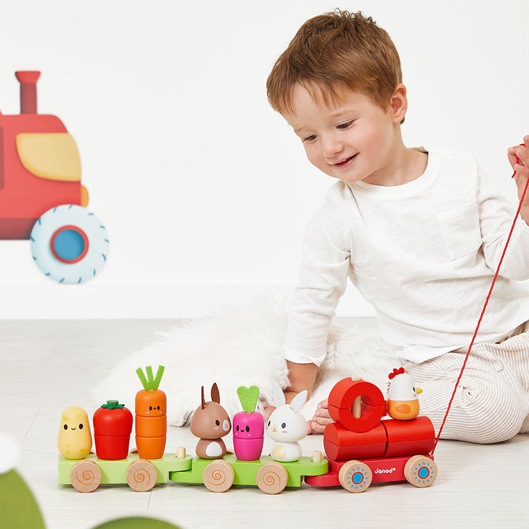 Janod Dřevěný dětský vláček s kostkami a figurkami na tahání Farma