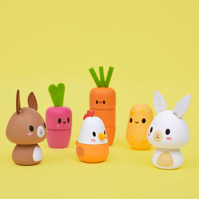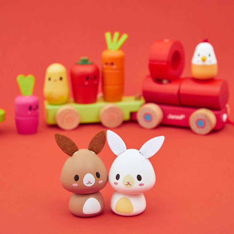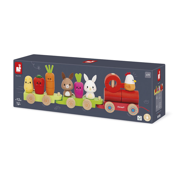 Sada se skládá ze tří vagonů s tyčemi a až 19 barevných dílků k sestavení - včetně částí lokomotivy, kuřat, králíků, zeleniny, jako je brambora, rajče, řepa nebo vícedílná mrkev.