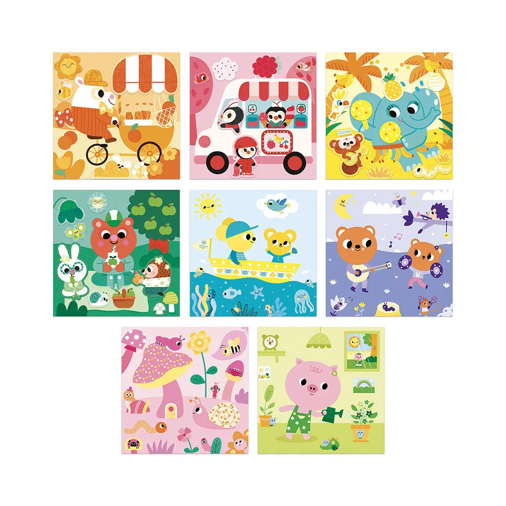 S touto kreativní sadou Janod mohou batolata pomocí kulatých pěnových mozaik vyzdobit čtyři obrázky a vytvořit tak výrazné a barevné ilustrace.