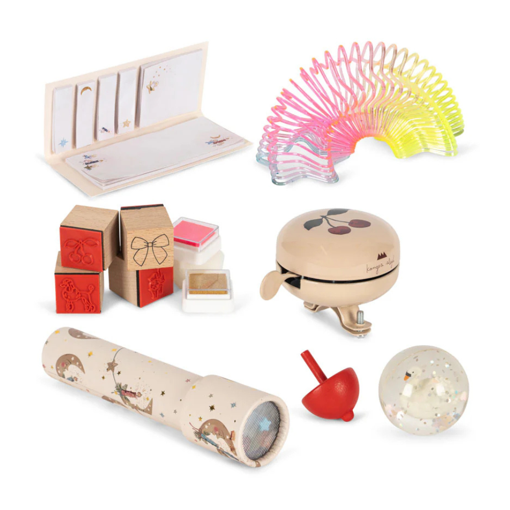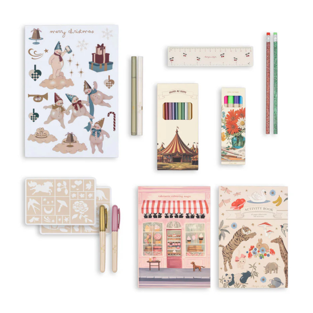- Sada obsahuje: Vánoční tetování, malého medvídka, knihu aktivit (20 stran), 12 metalických pastelek, kaleidoskop, kouzelnou pružinu, tetovací tužky se šablonami, samolepky, spinner, karetní hru "Černá kočka", skákací míč, paměťovou hru (30 ks), samolepky na okno (2 listy), zvonek na kolo, omalovánky A5 (20 stran), razítka, dekorace, ozdobné kamínky, 4 kouzelné fixy, zápisník, minipuzzle, fixy na okno (2 ks).), pravítko a třpytivé tužky