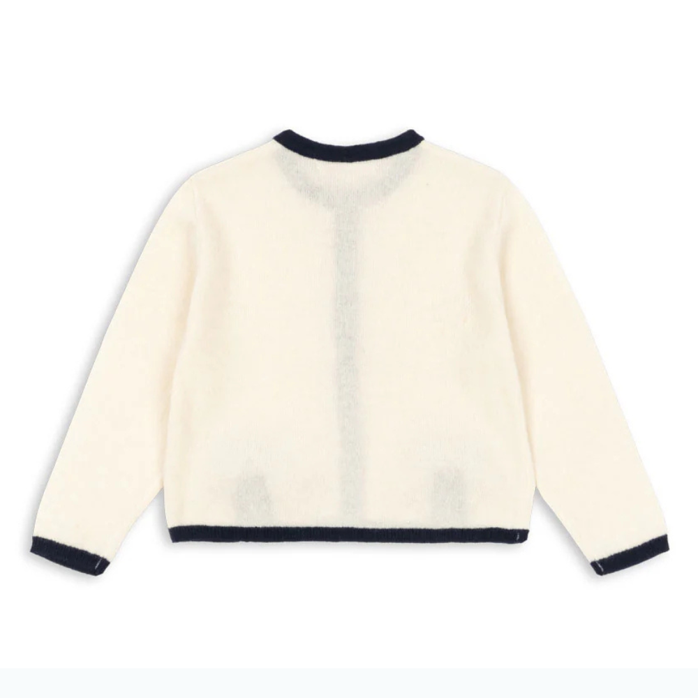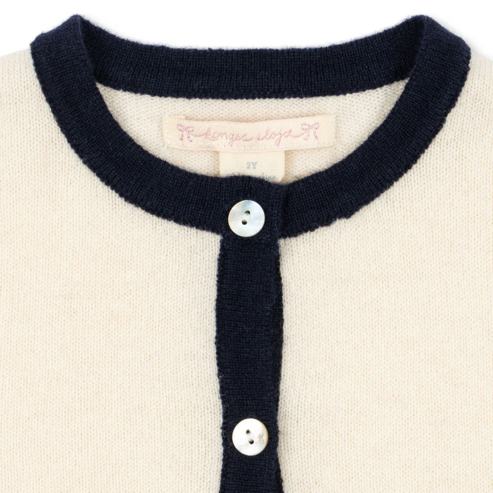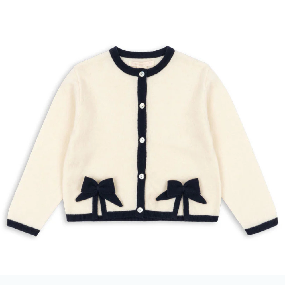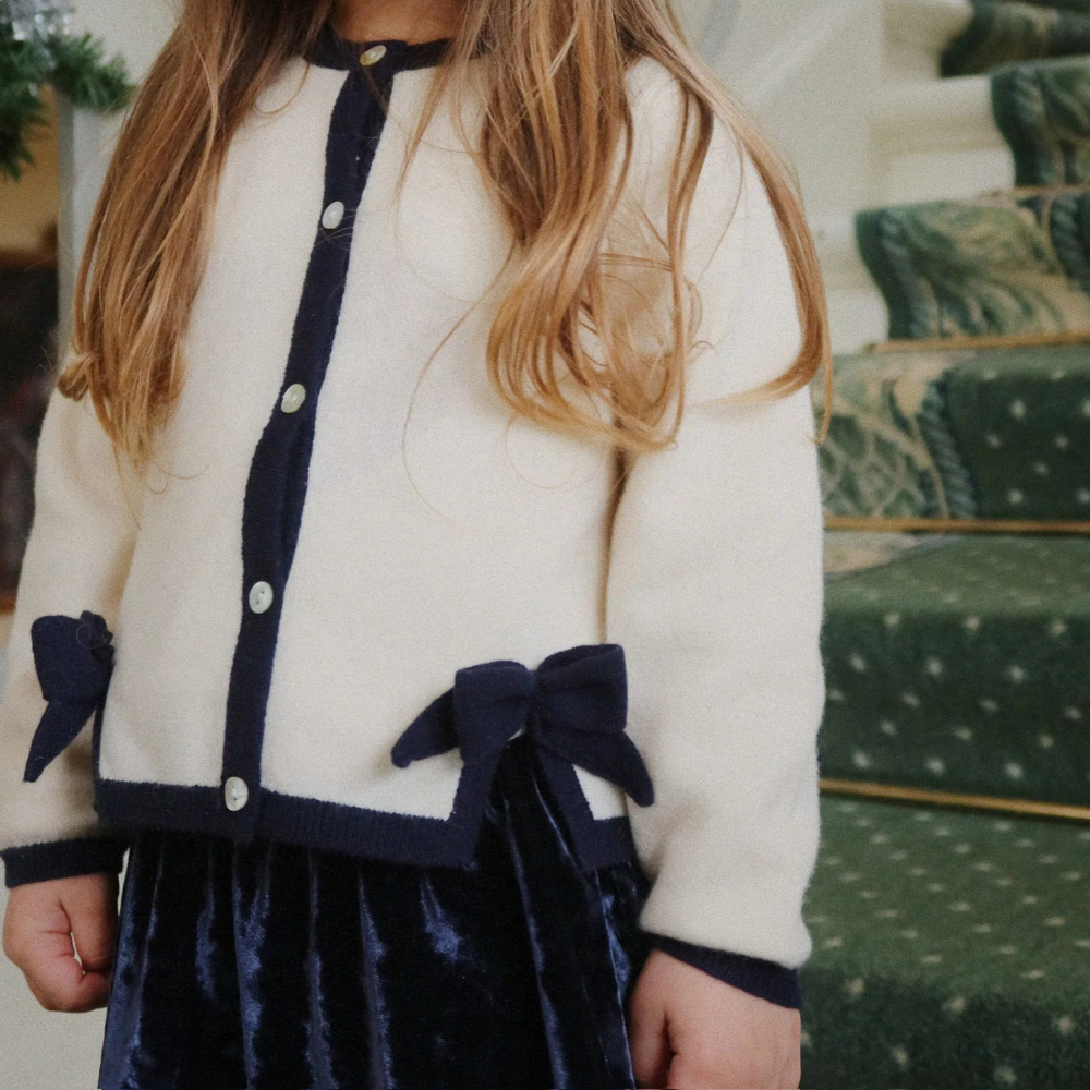 Tento dětský svetr má klasický střih s kulatým výstřihem, kontrastním lemováním a perleťovými knoflíky, jemné mašličky mu dodávají decentní půvab.