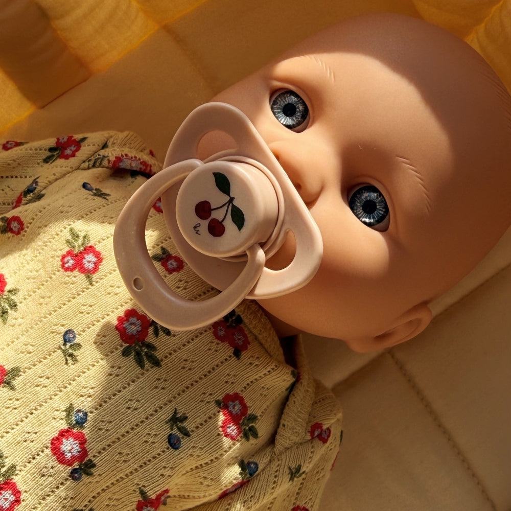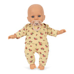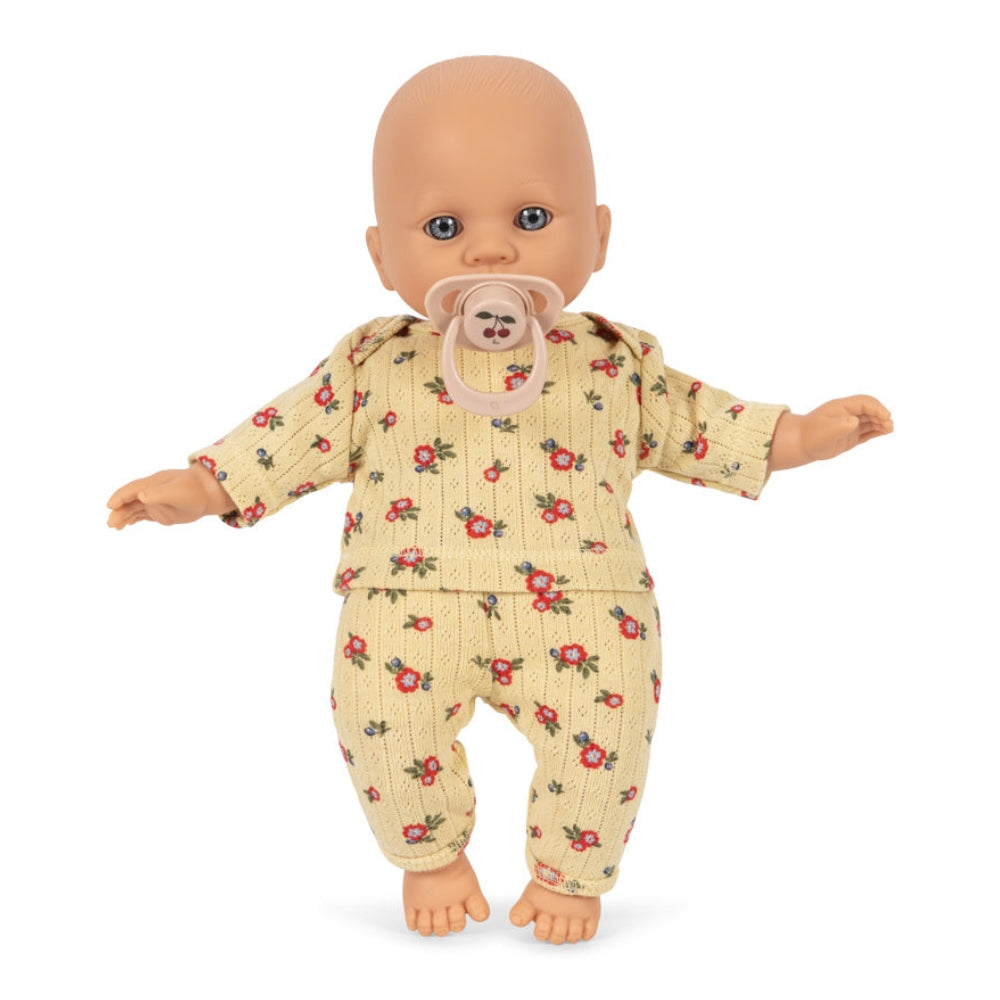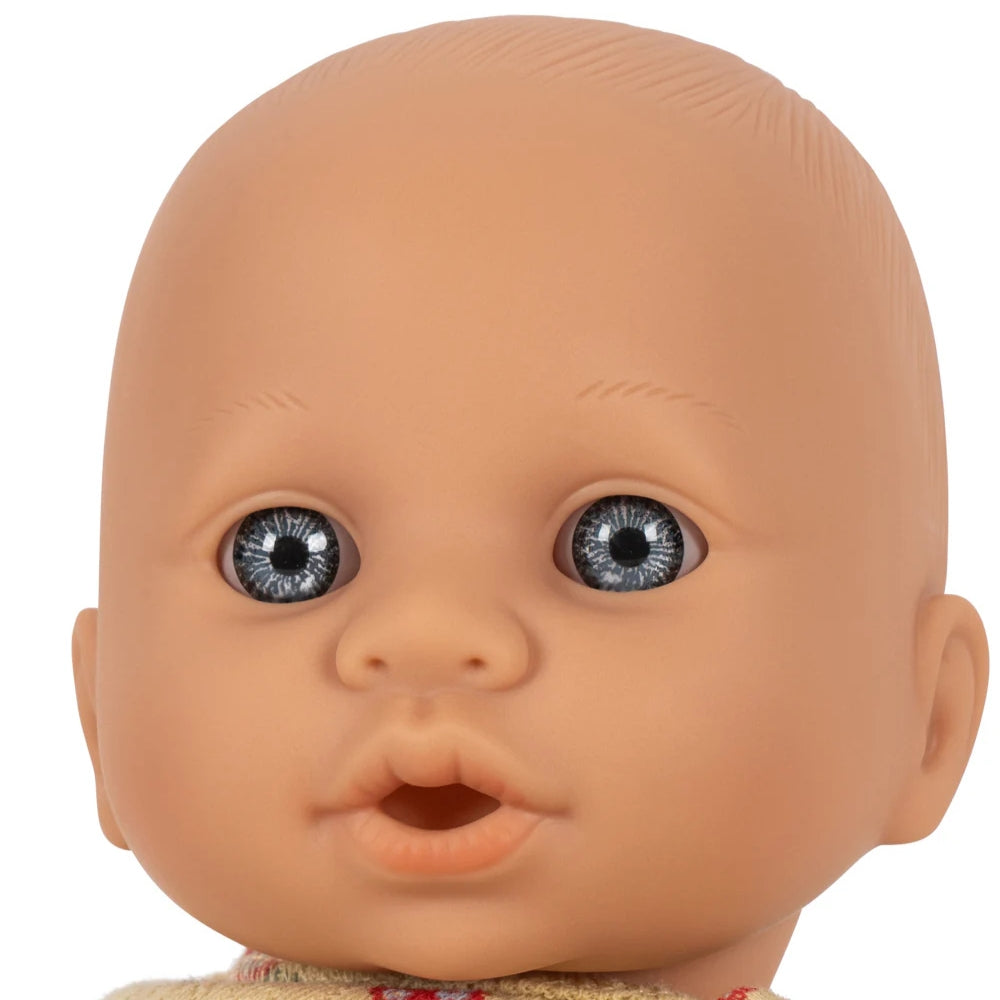 - Materiál: vinylové tělo, bavlněná výplň, oblečení z bavlněné a polyesterové tkaniny, dudlík z PP